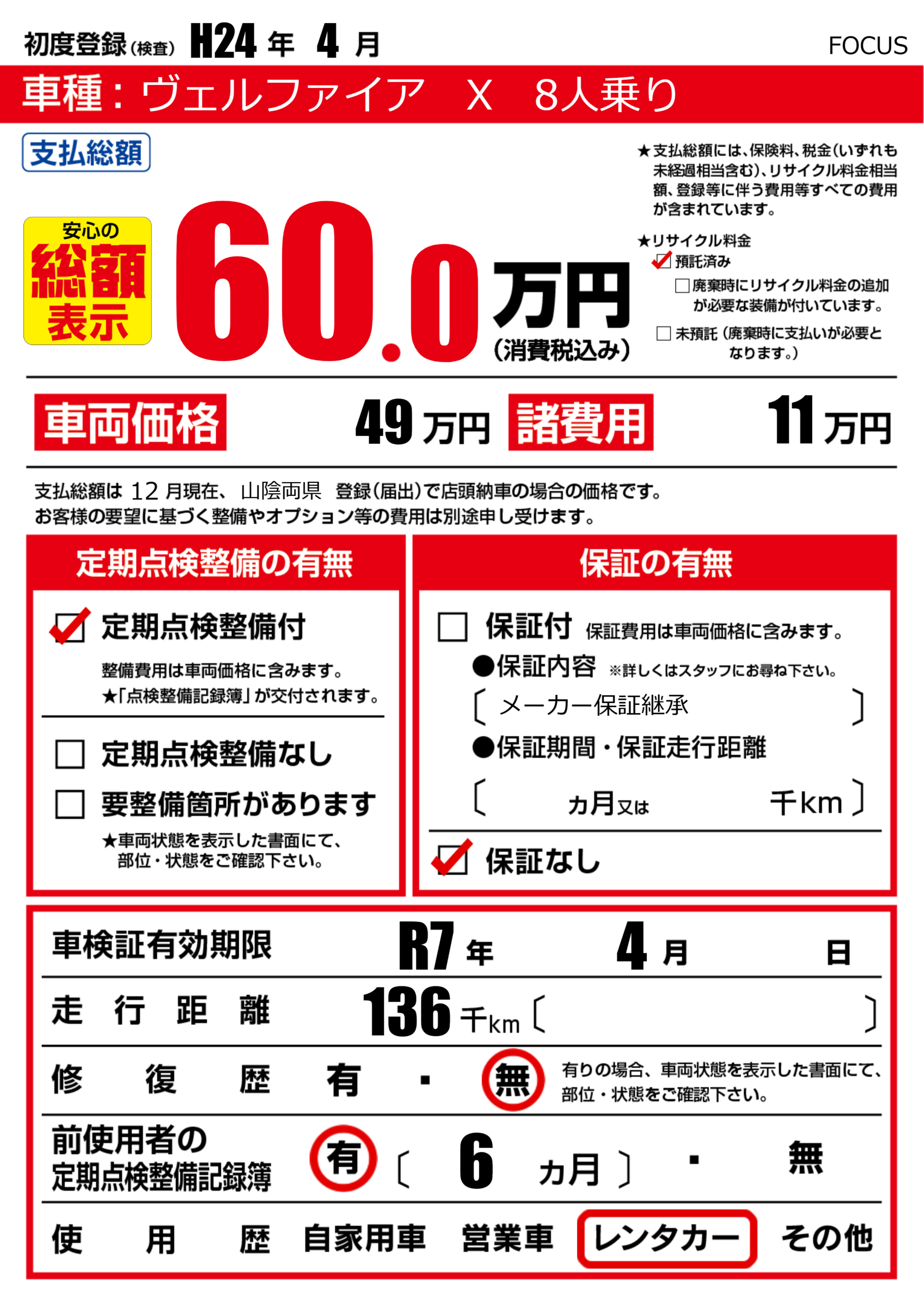 | 走行キロ | 13.6万km | 初年度登録 | H24年4月 |