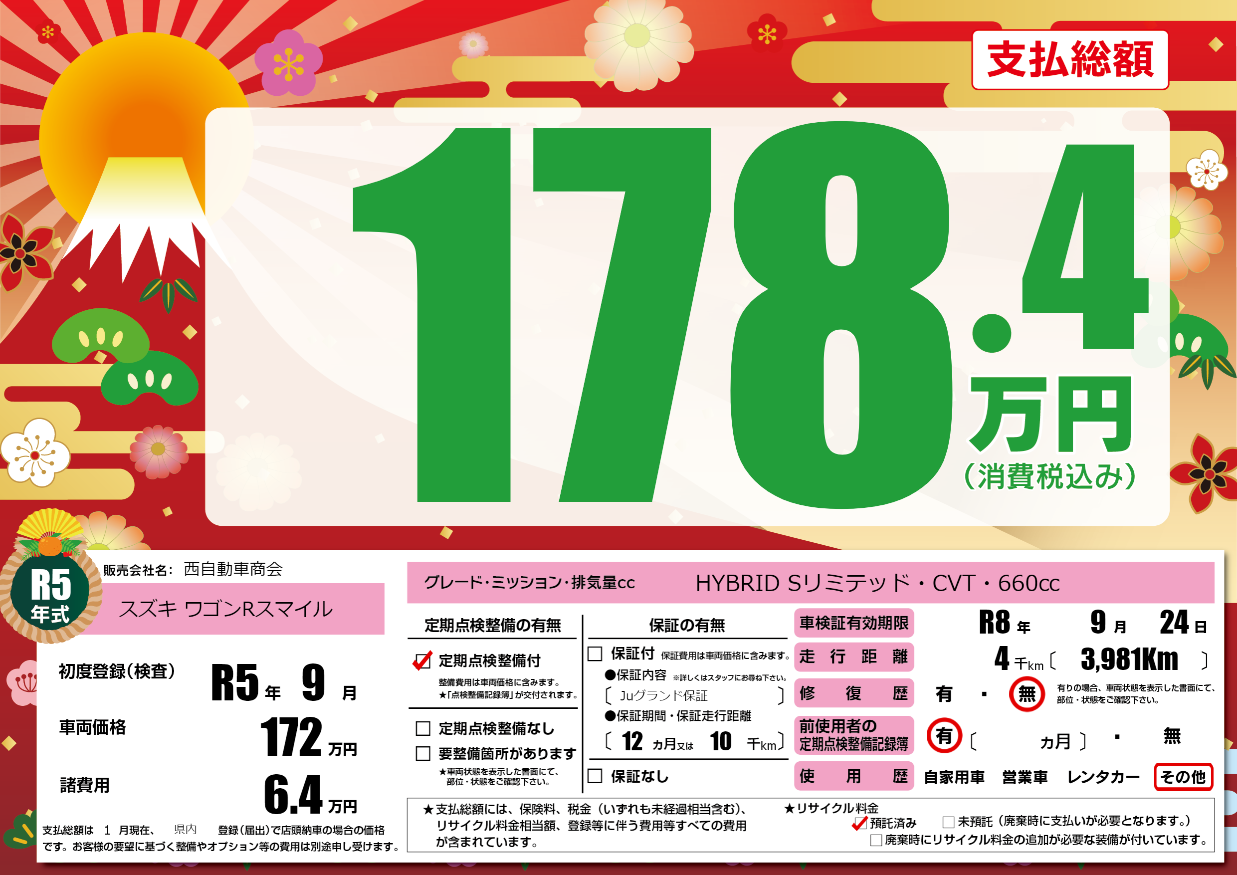 | 走行キロ | 0.4万km | 初年度登録 | R5年9月 |
