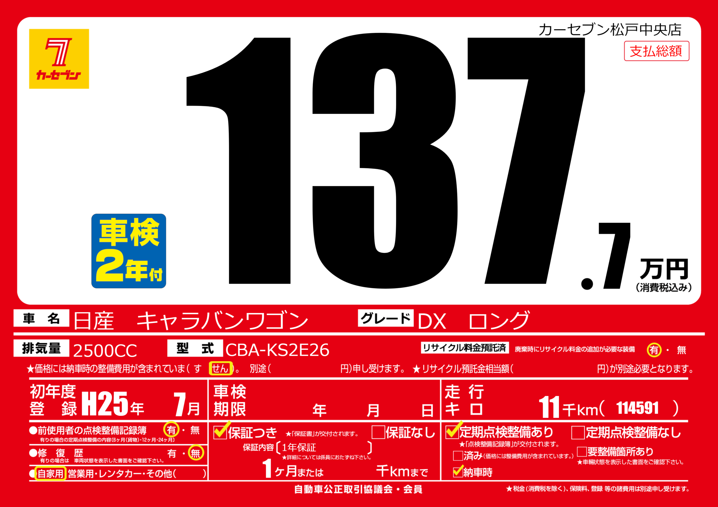 | 車名 | 日産 キャラバンワゴン | グレード ミッション 排気量 |