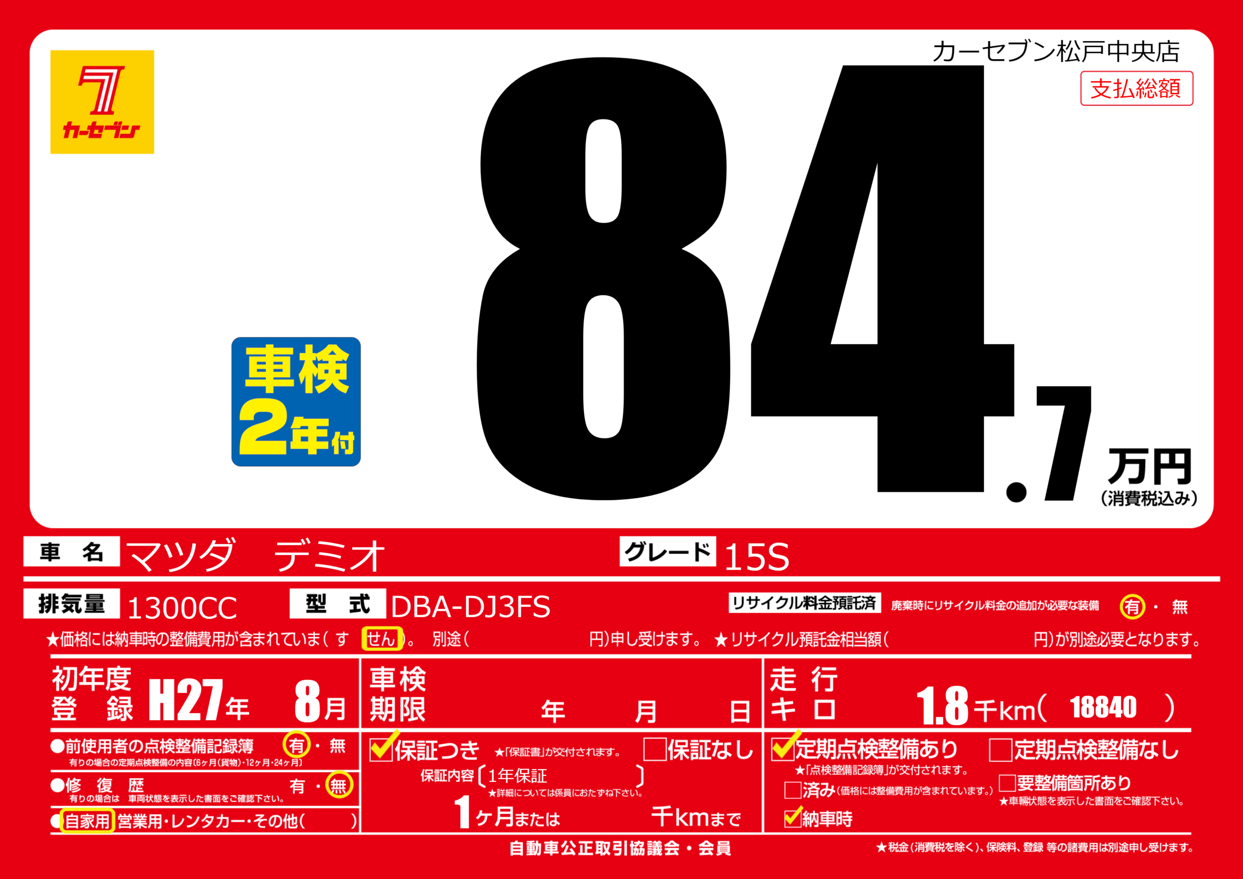 | 車名 | マツダ デミオ | グレード ミッション 排気量 |