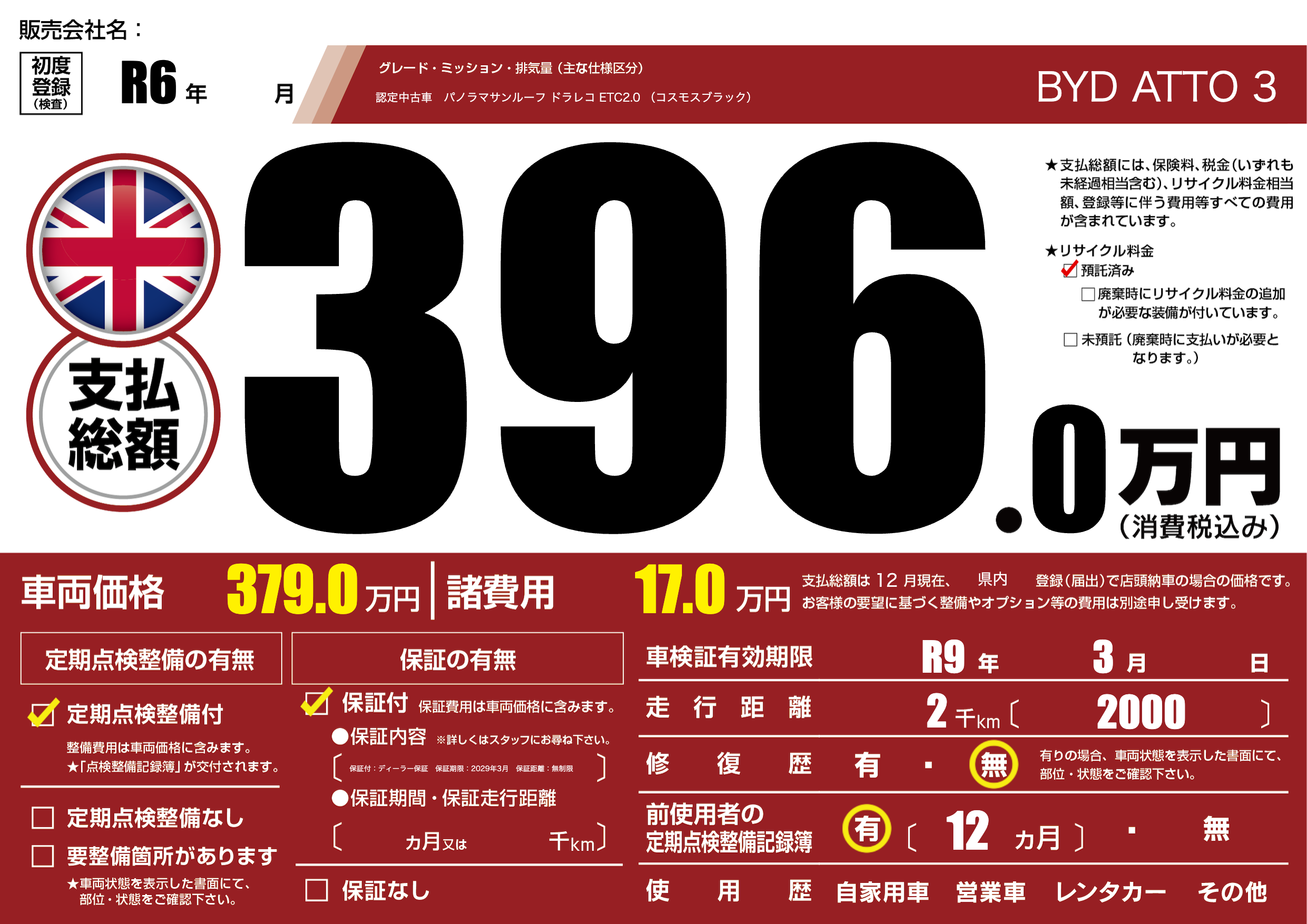 | 車名 | BYD ATTO 3 | グレード ミッション 排気量 |