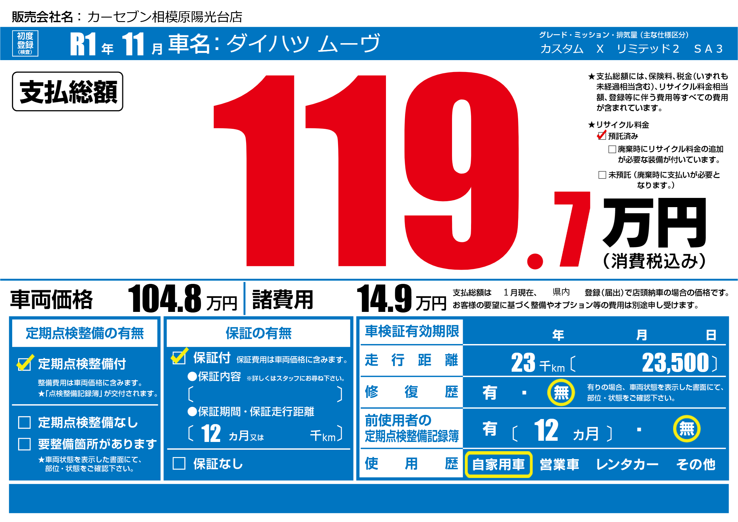 | 走行キロ | 2.3万km | 初年度登録 | R1年11月 |