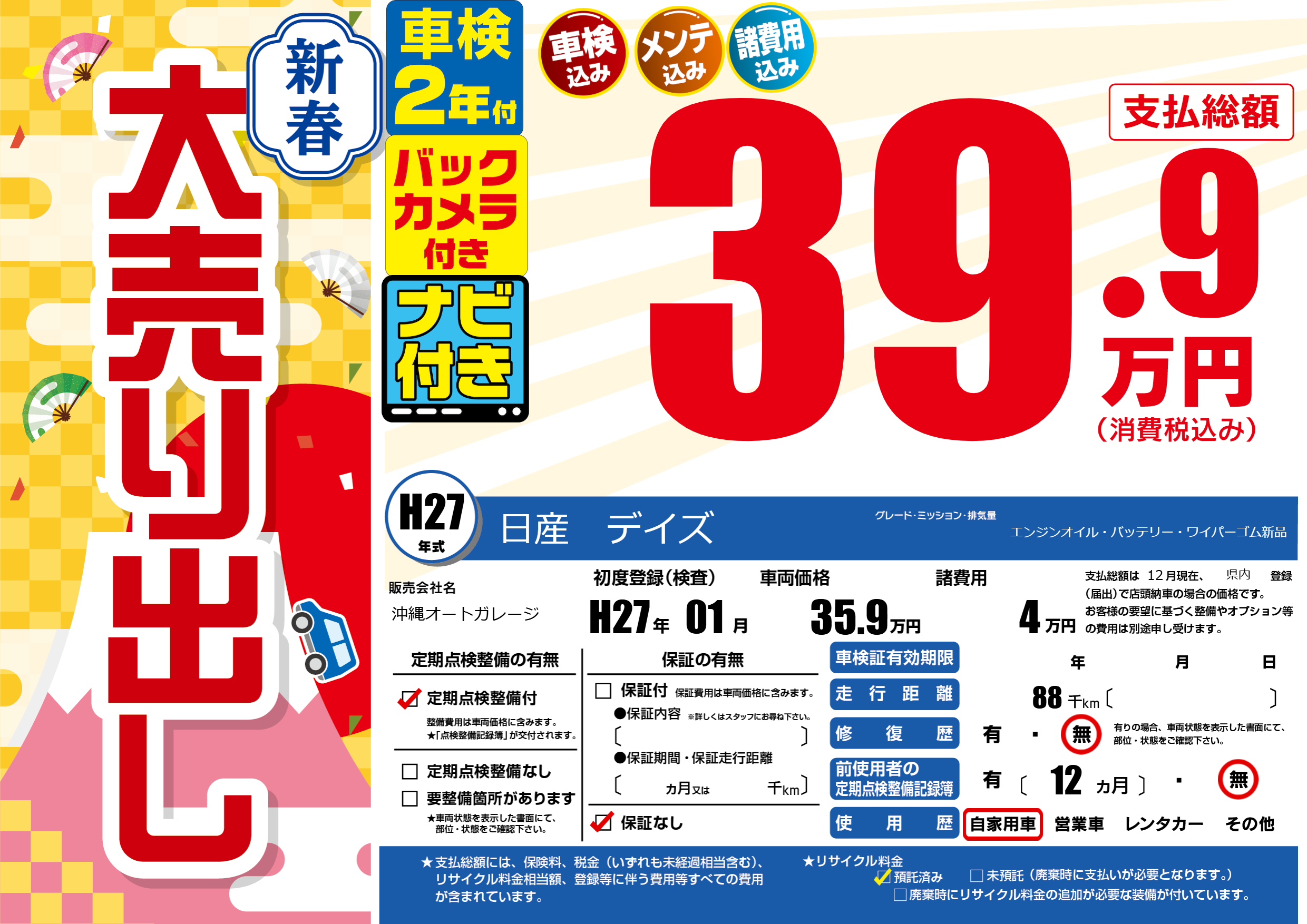 | 車名 | 日産 デイズ | グレード ミッション 排気量 |