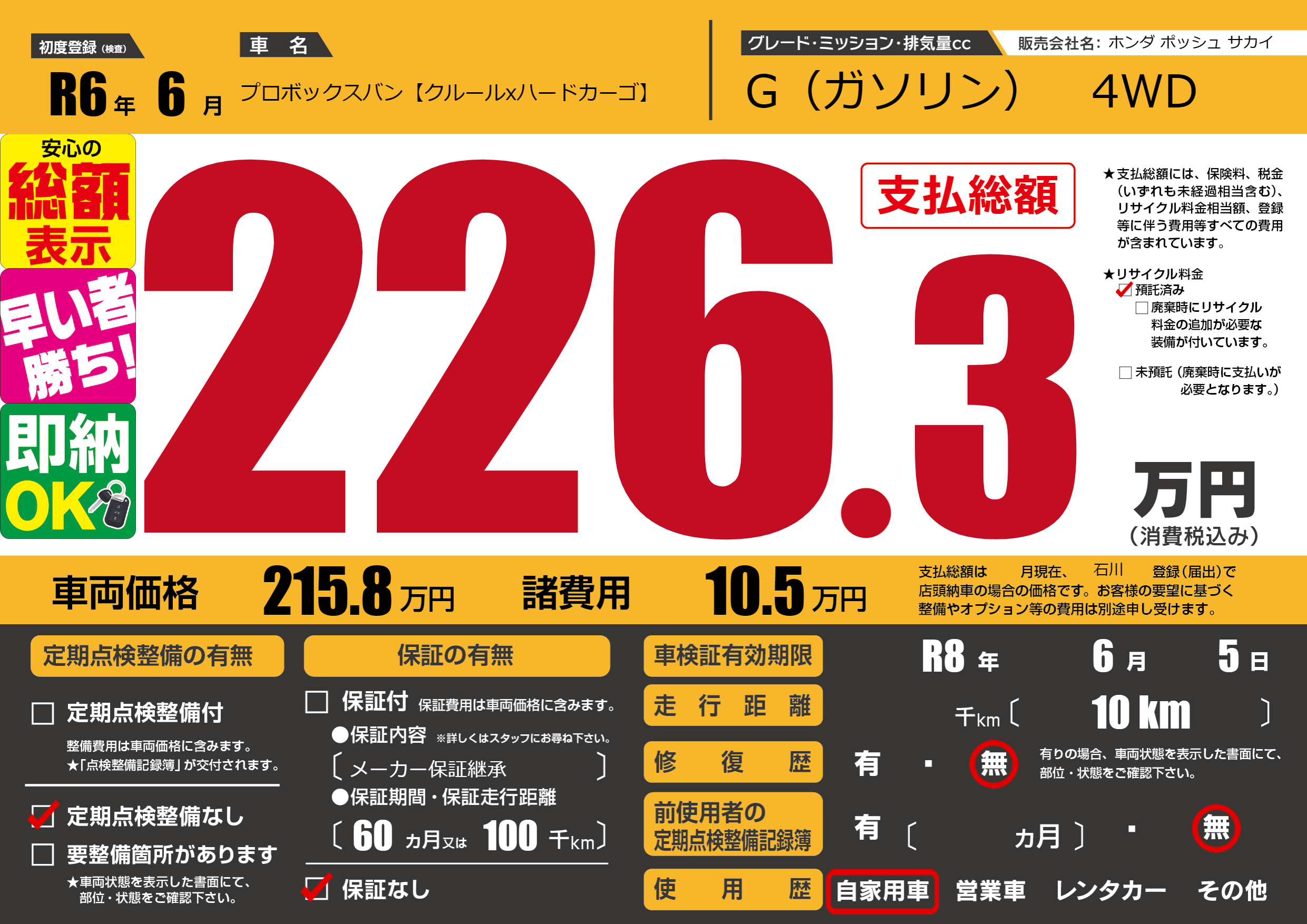 保証なし 保証内容(メーカー保証継承) 60ヶ月または(100)千kmまで |
