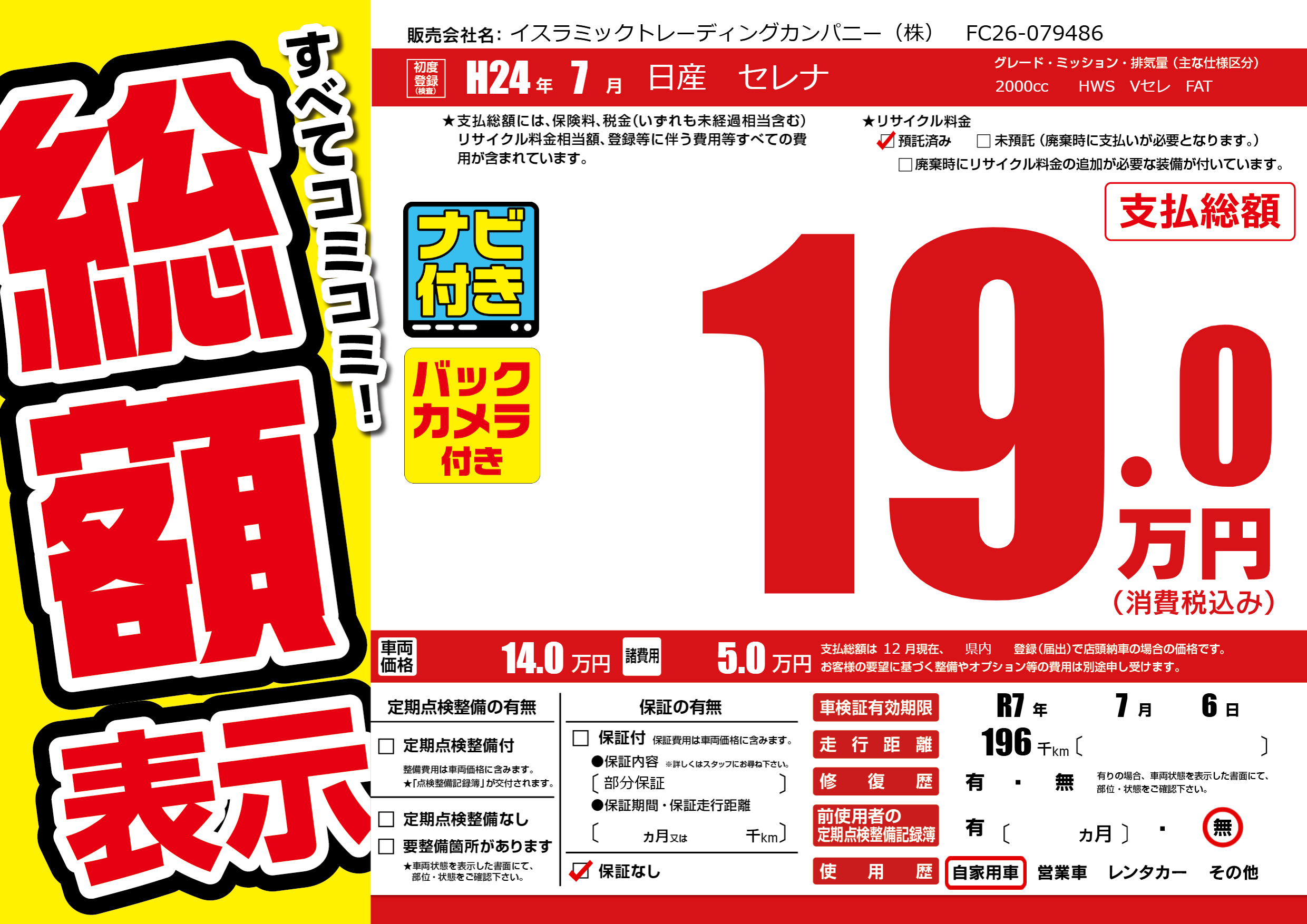 | 走行キロ | 19.6万km | 初年度登録 | H24年7月 |