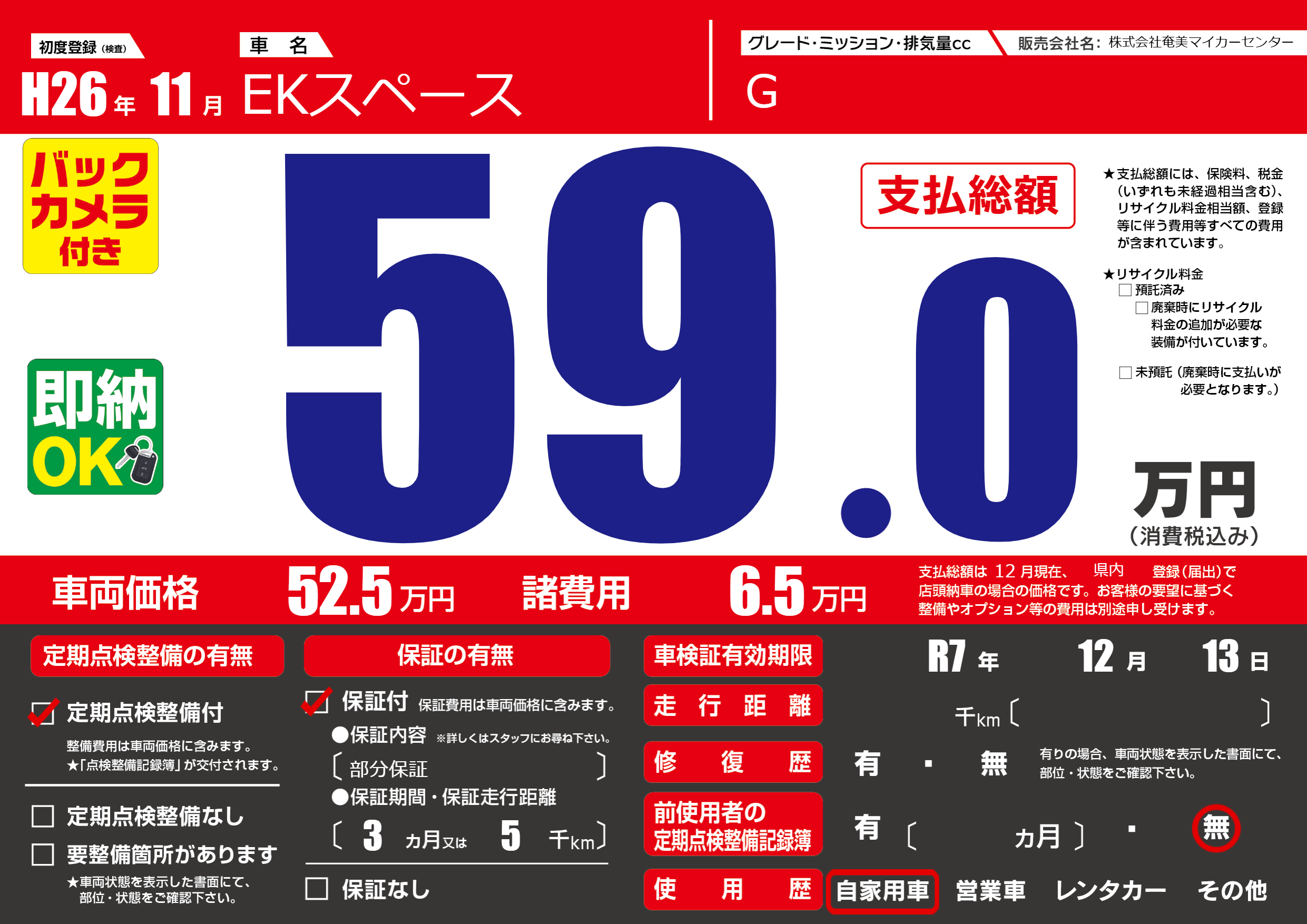 | 走行キロ | - | 初年度登録 | H26年11月 |