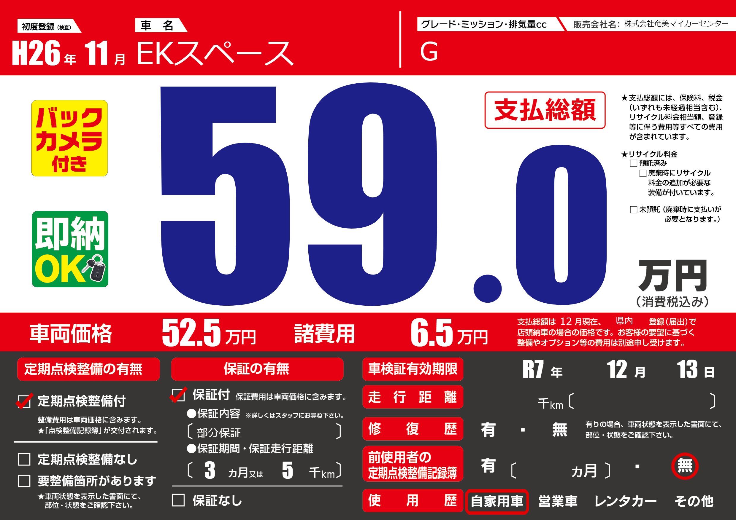 | 走行キロ | - | 初年度登録 | H26年11月 |