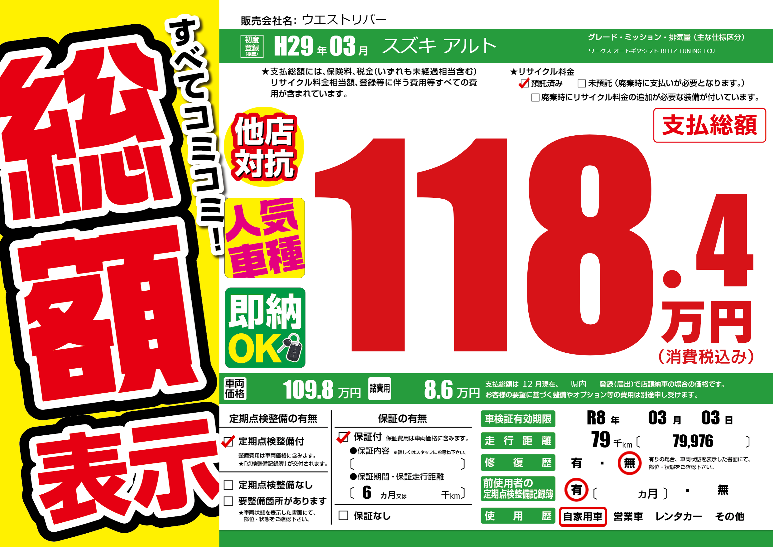 | 車名 | スズキ アルト | グレード ミッション 排気量 |