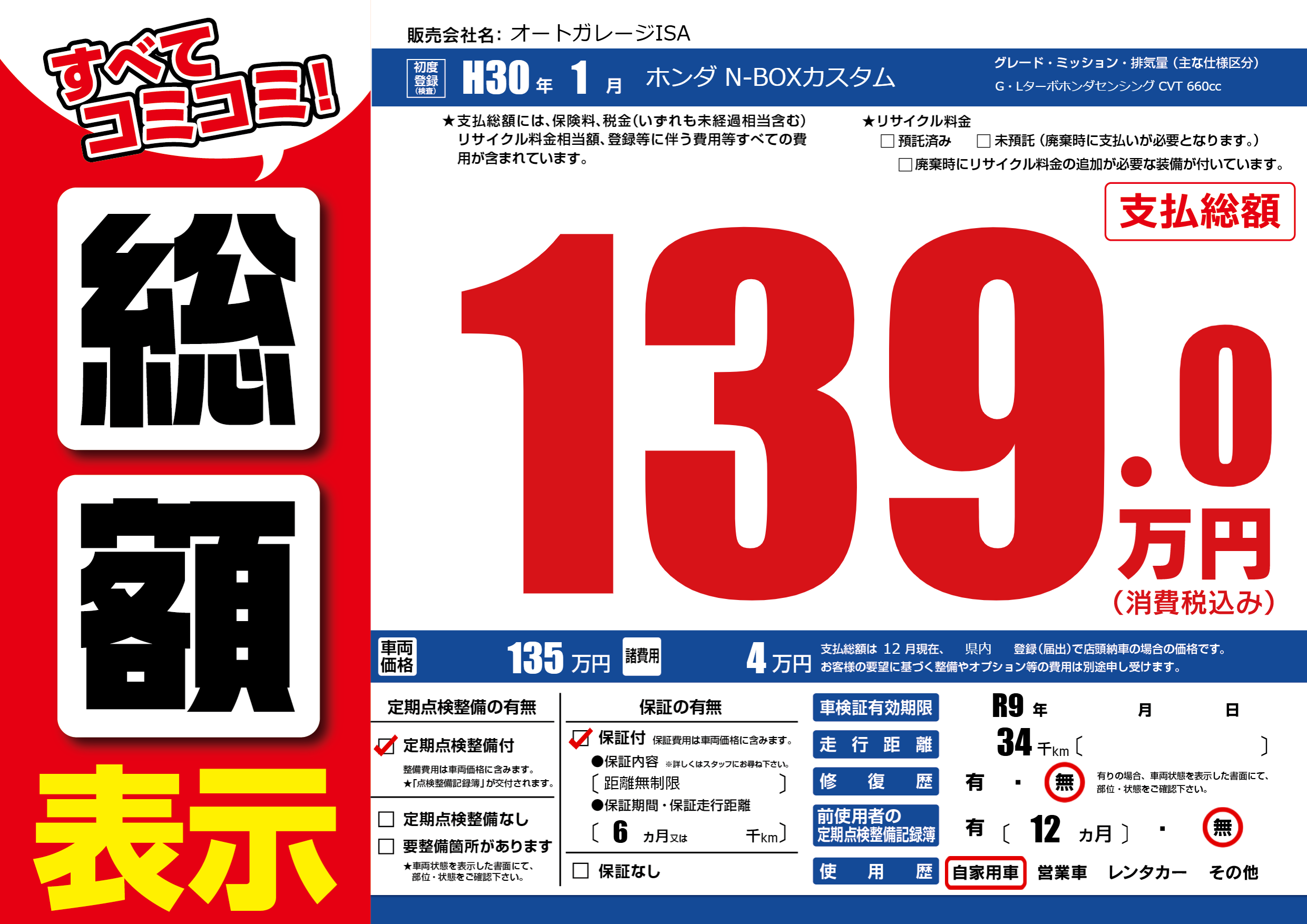 | 車検制限 | R9年 - 月 - 日 | ||