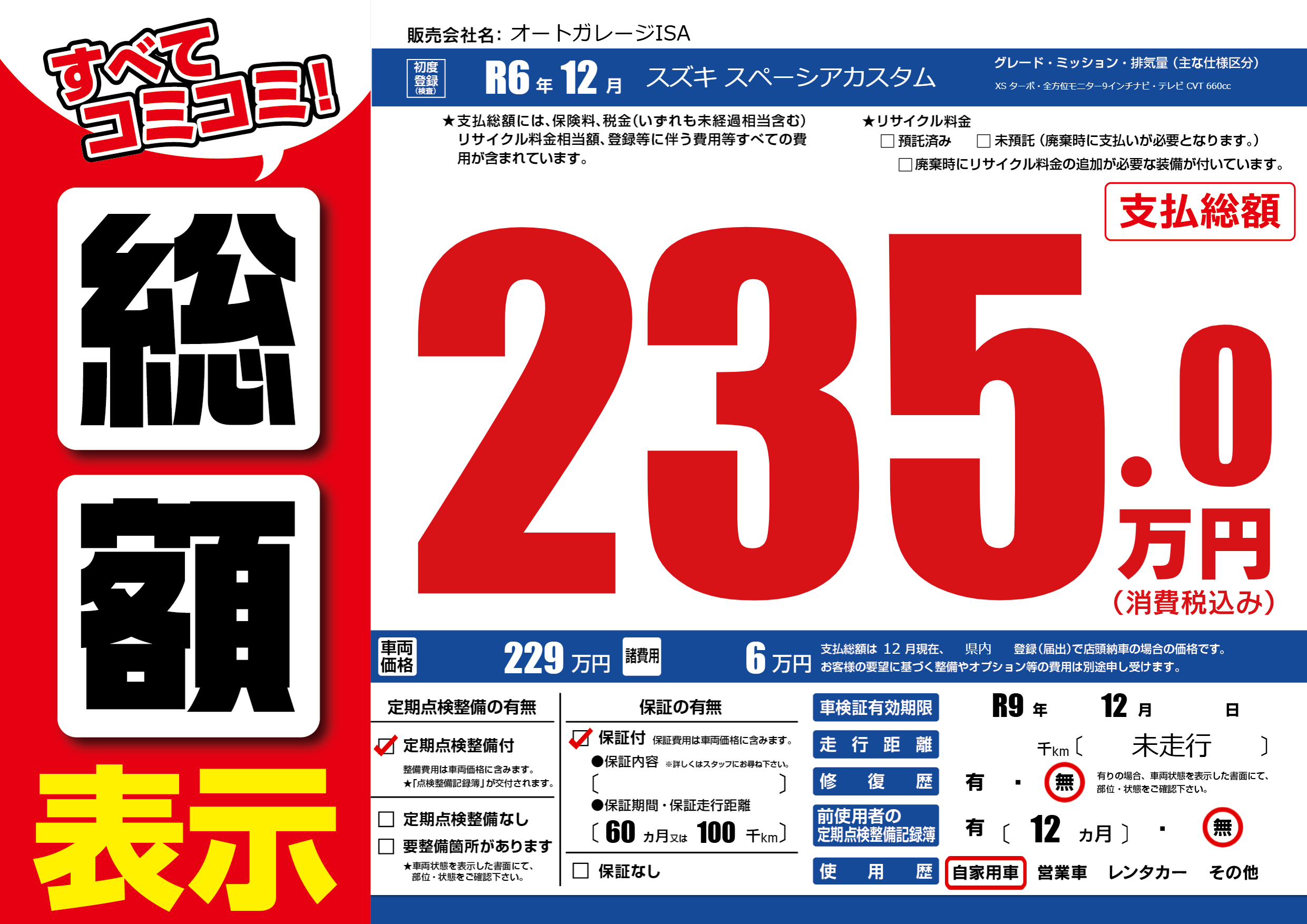 | 車検制限 | R9年 12月 - 日 | ||