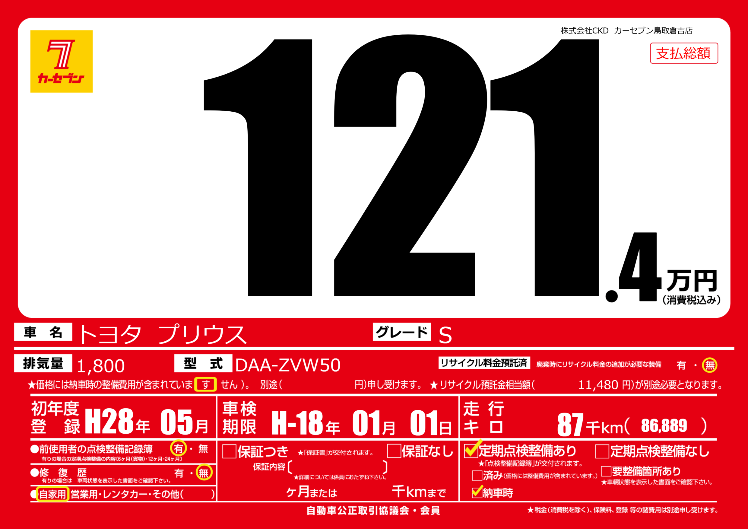 | 車名 | トヨタ プリウス | グレード ミッション 排気量 |