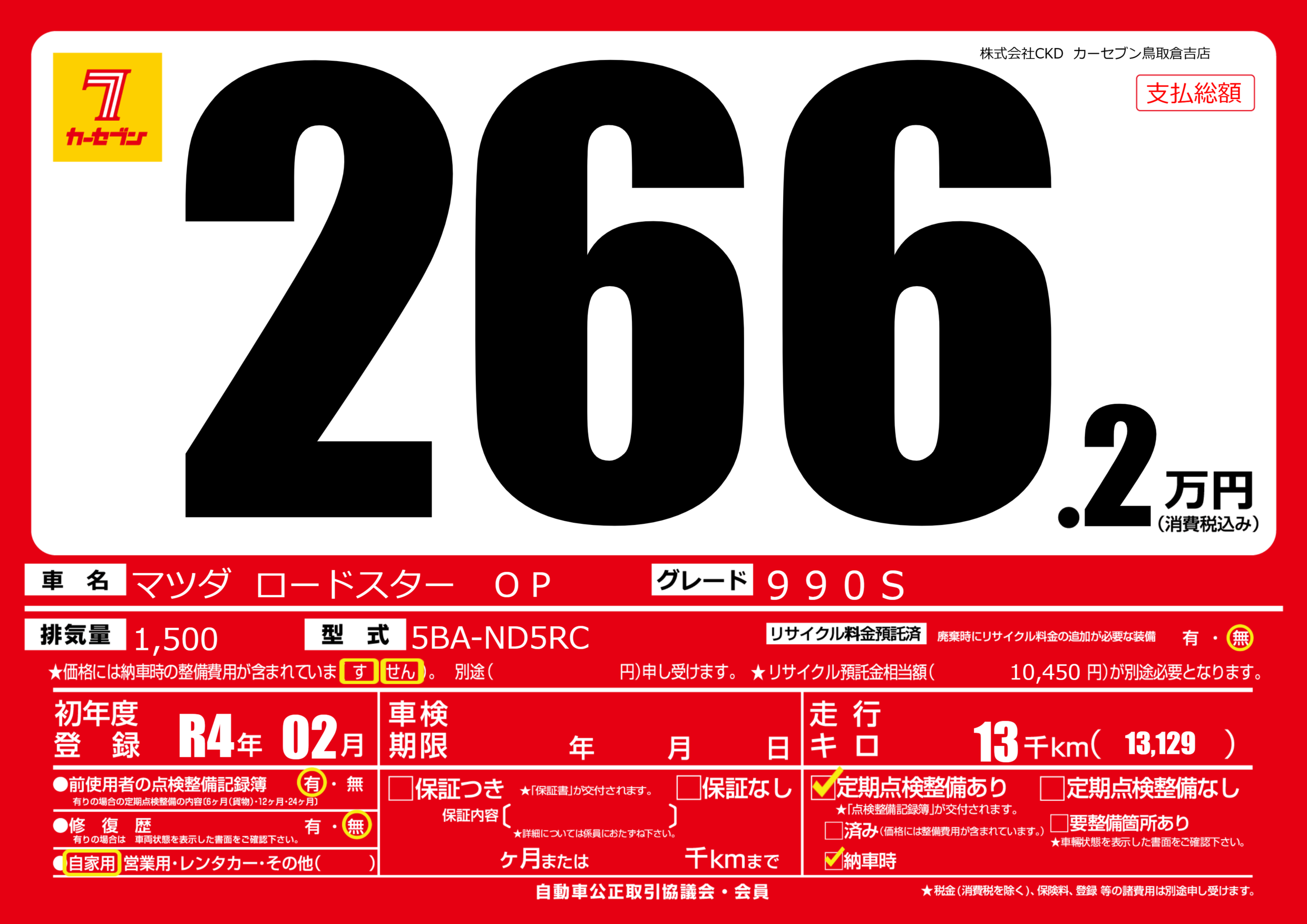 | 車名 | マツダ ロードスター OP | グレード ミッション 排気量 |