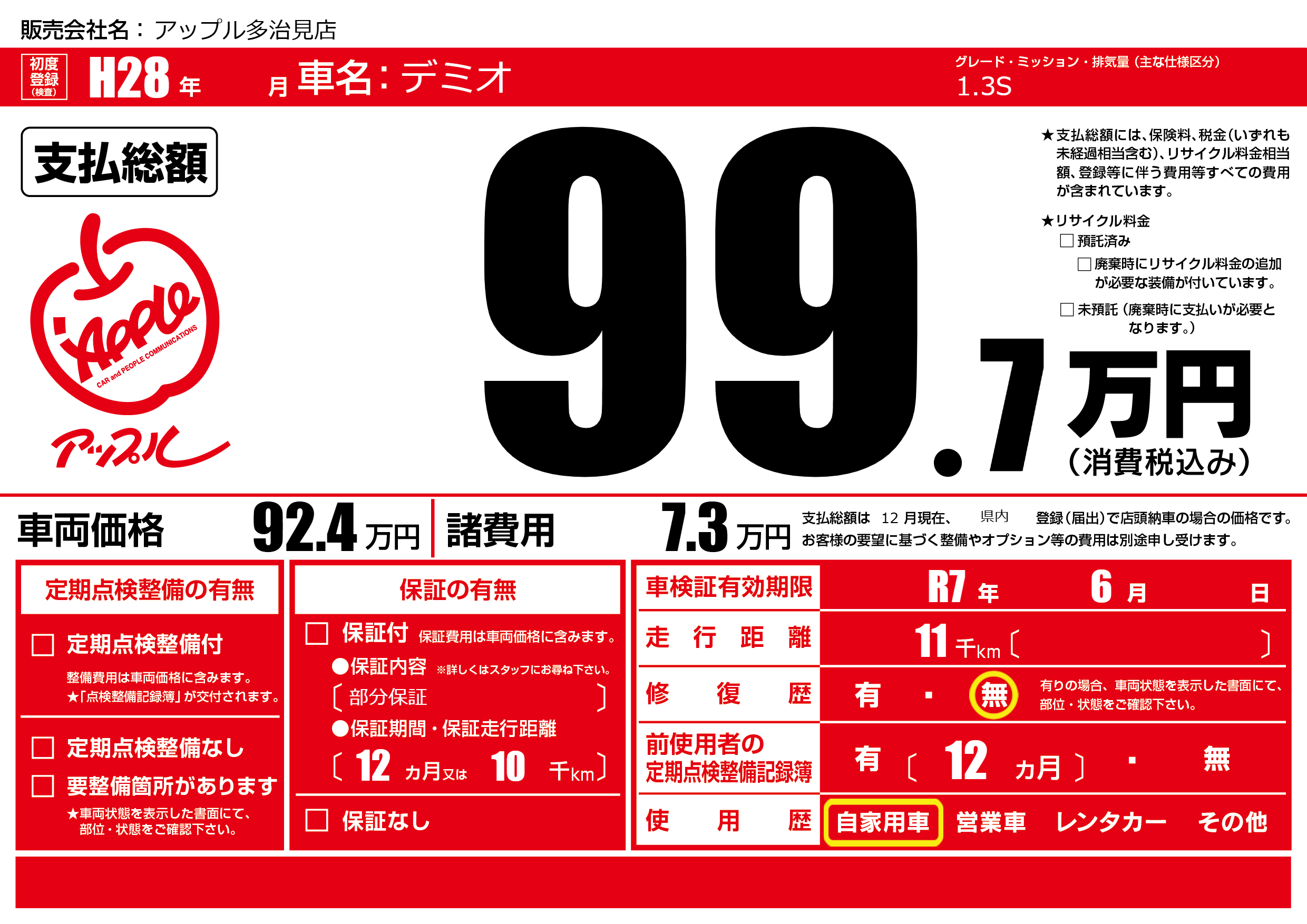 | 車名 | デミオ | グレード ミッション 排気量 |