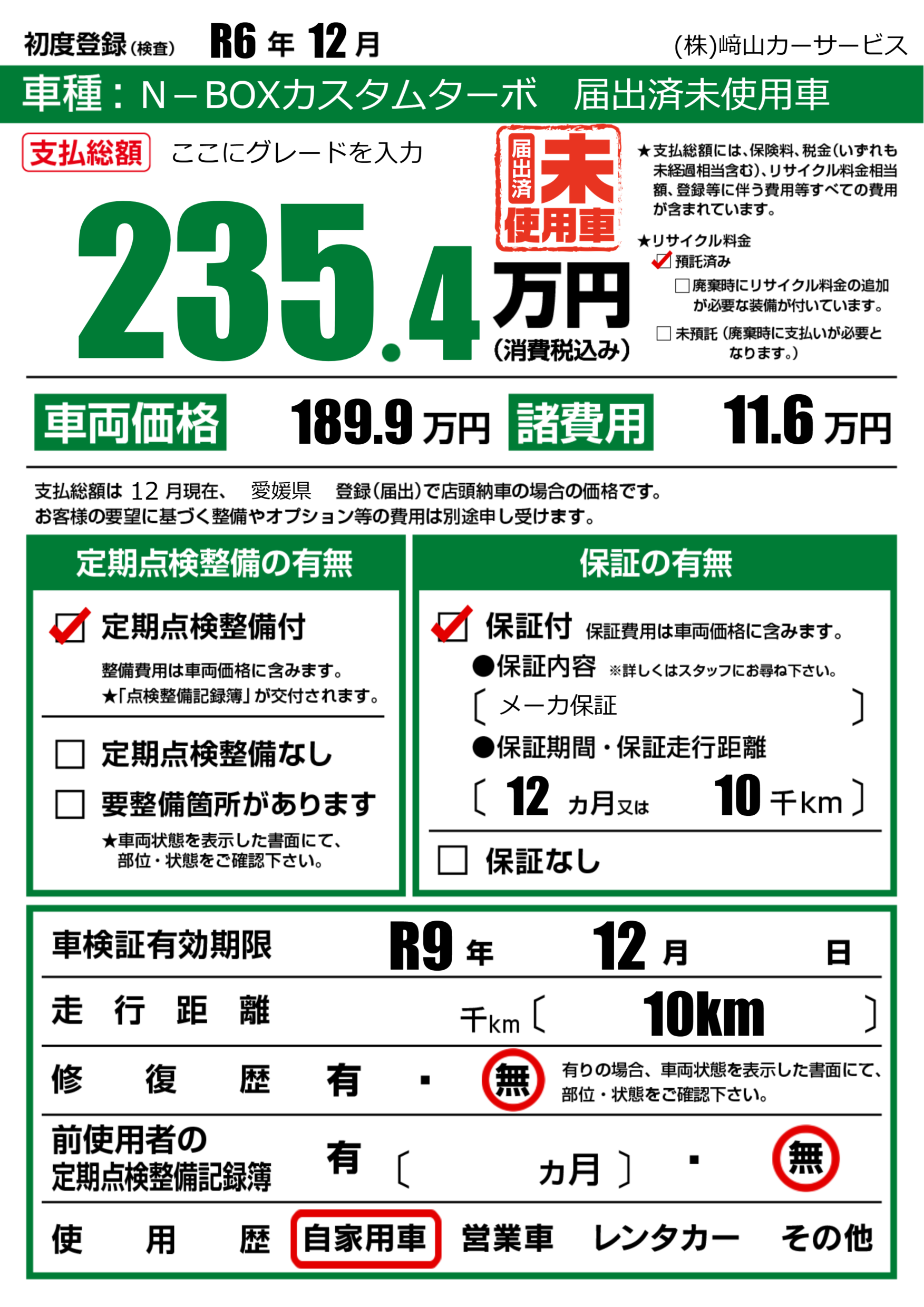 | 車名 | N-BOXカスタムターボ 届出済未使用車 | グレード ミッション 排気量 |