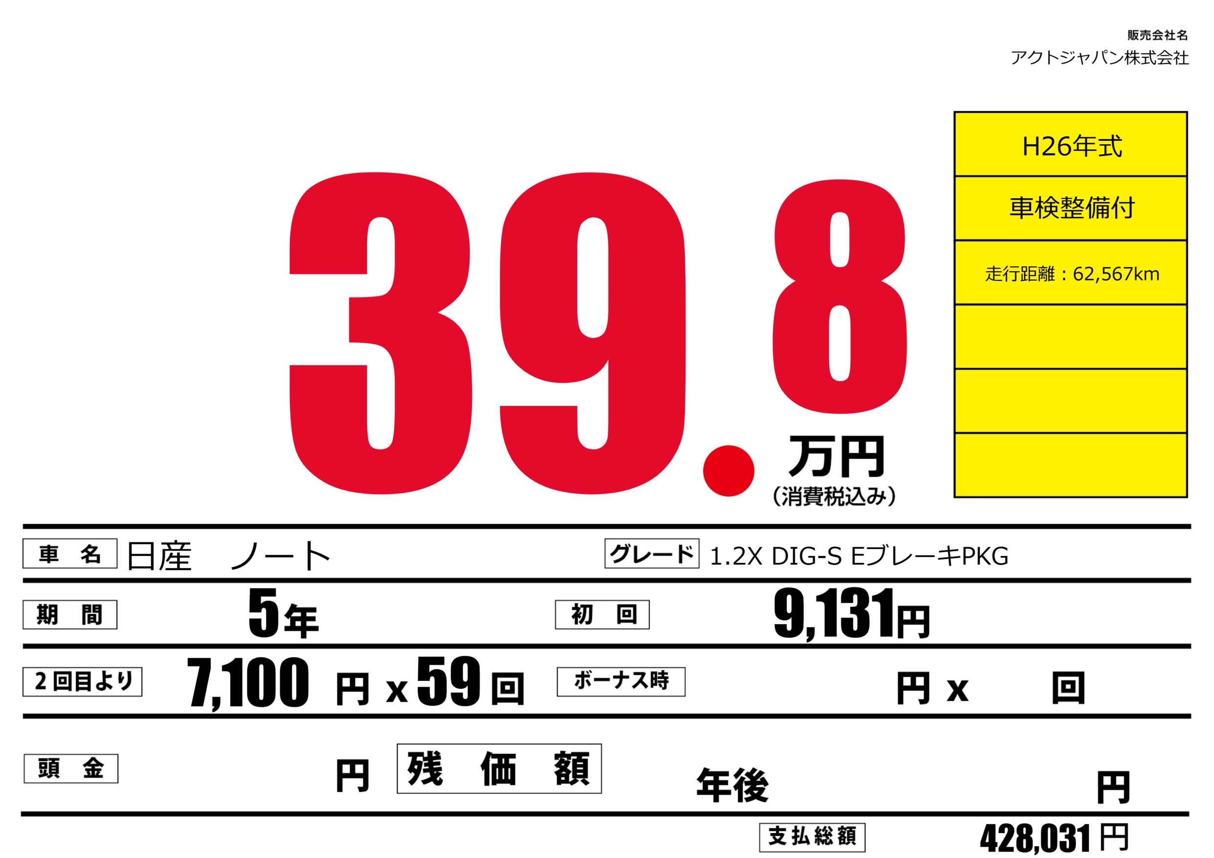 | 車名 | 日産 ノート | グレード ミッション 排気量 |