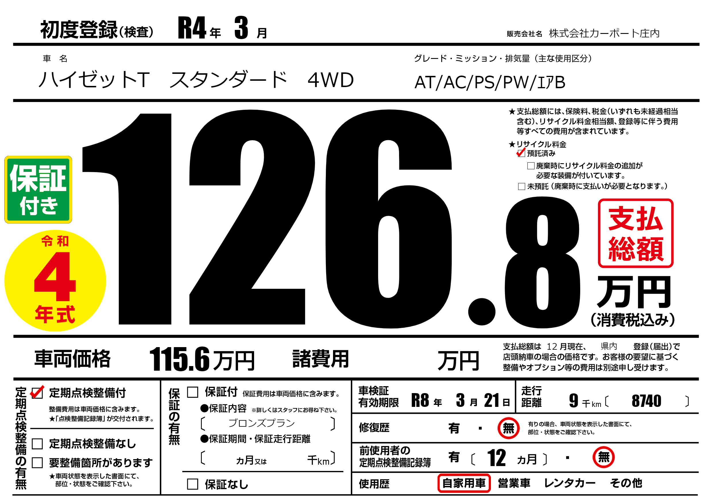 | 車名 | ハイゼットT スタンダード 4WD | グレード ミッション 排気量 |