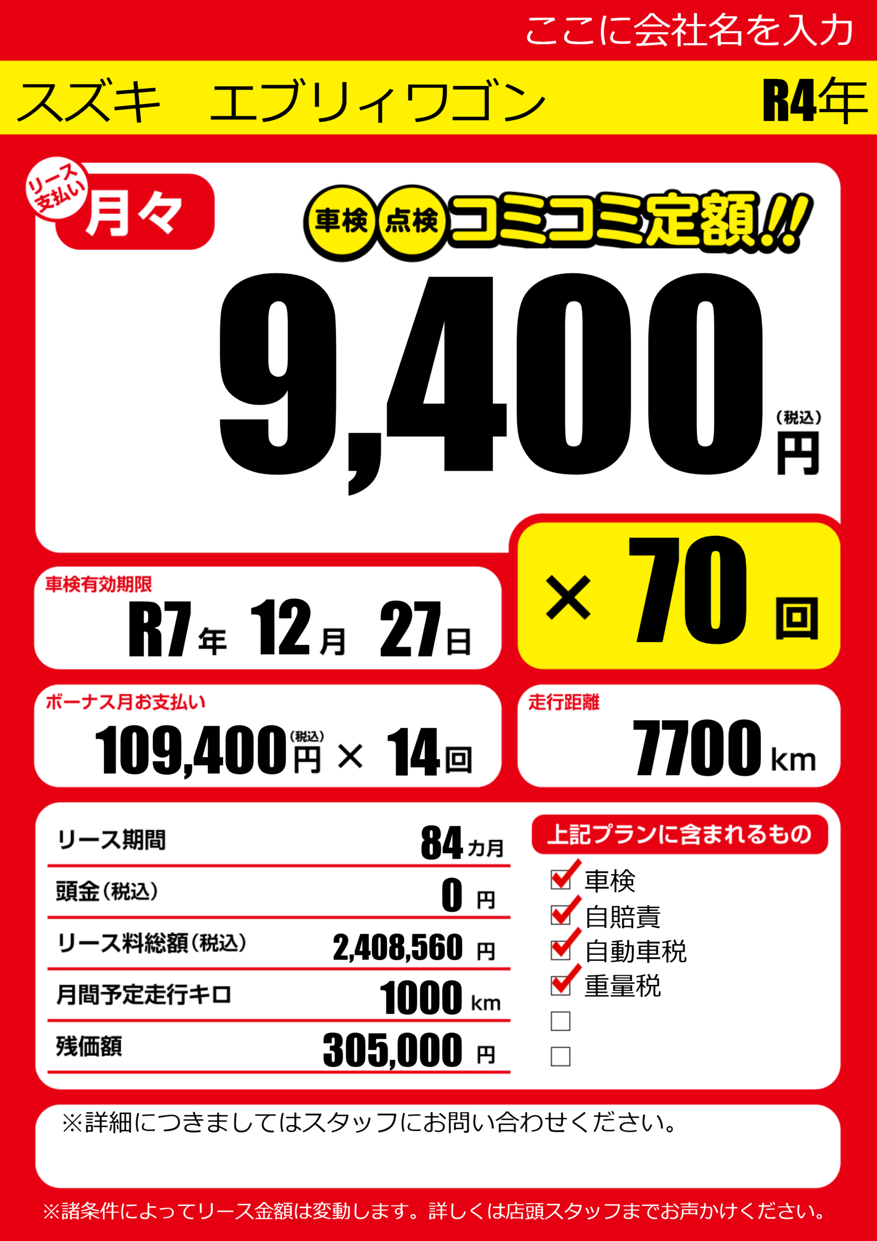 | 車名 | スズキ エブリィワゴン | グレード ミッション 排気量 |