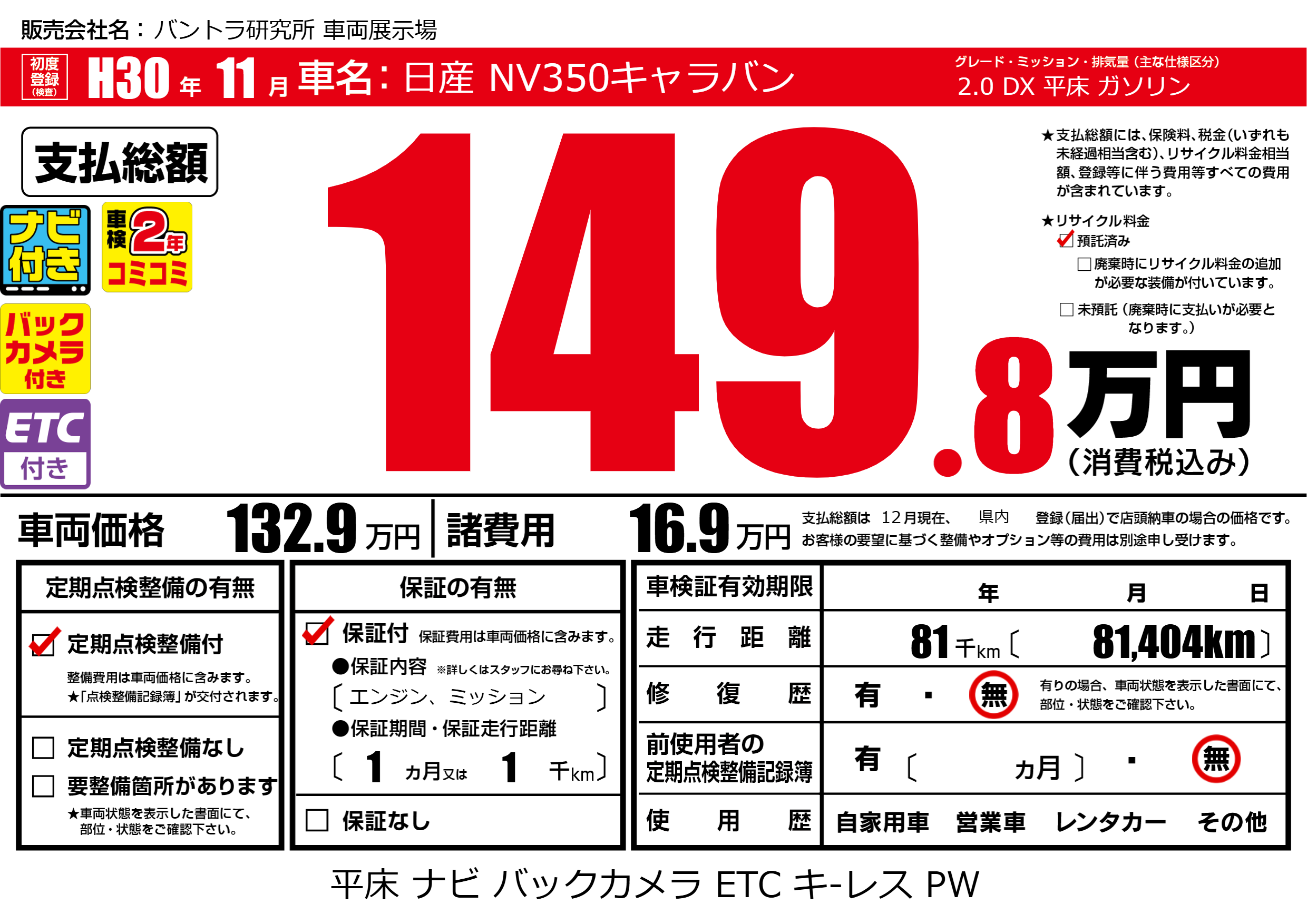 | 走行キロ | 8.1万km | 初年度登録 | H30年11月 |