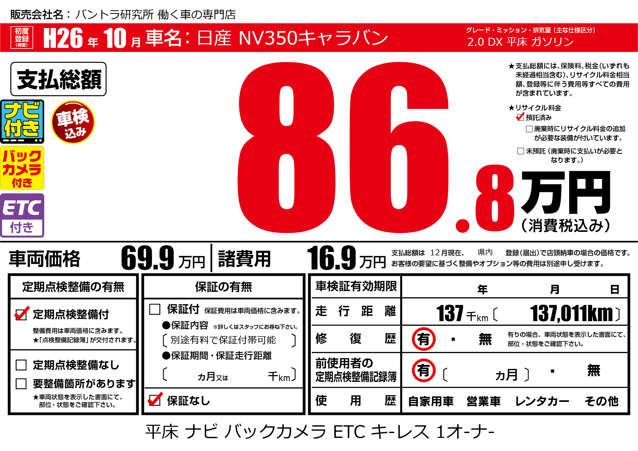 | 車名 | 日産 NV350キャラバン | グレード ミッション 排気量 |