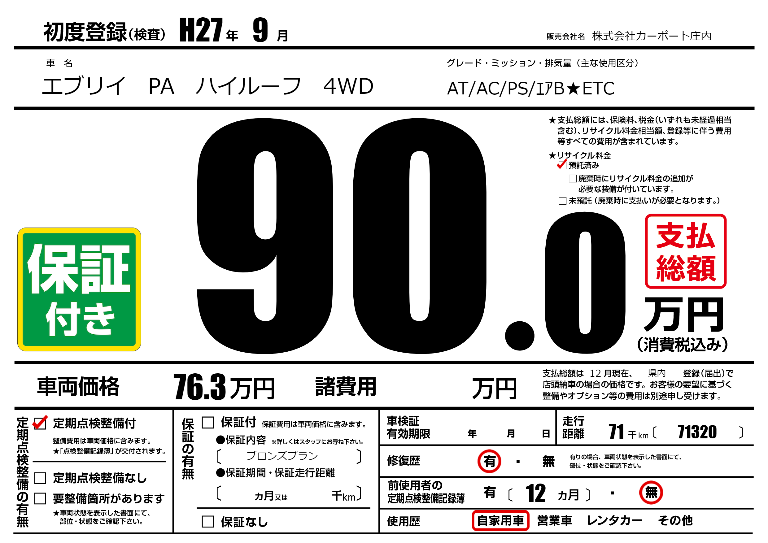 | 車名 | エブリイ PA ハイルーフ 4WD | グレード ミッション 排気量 |