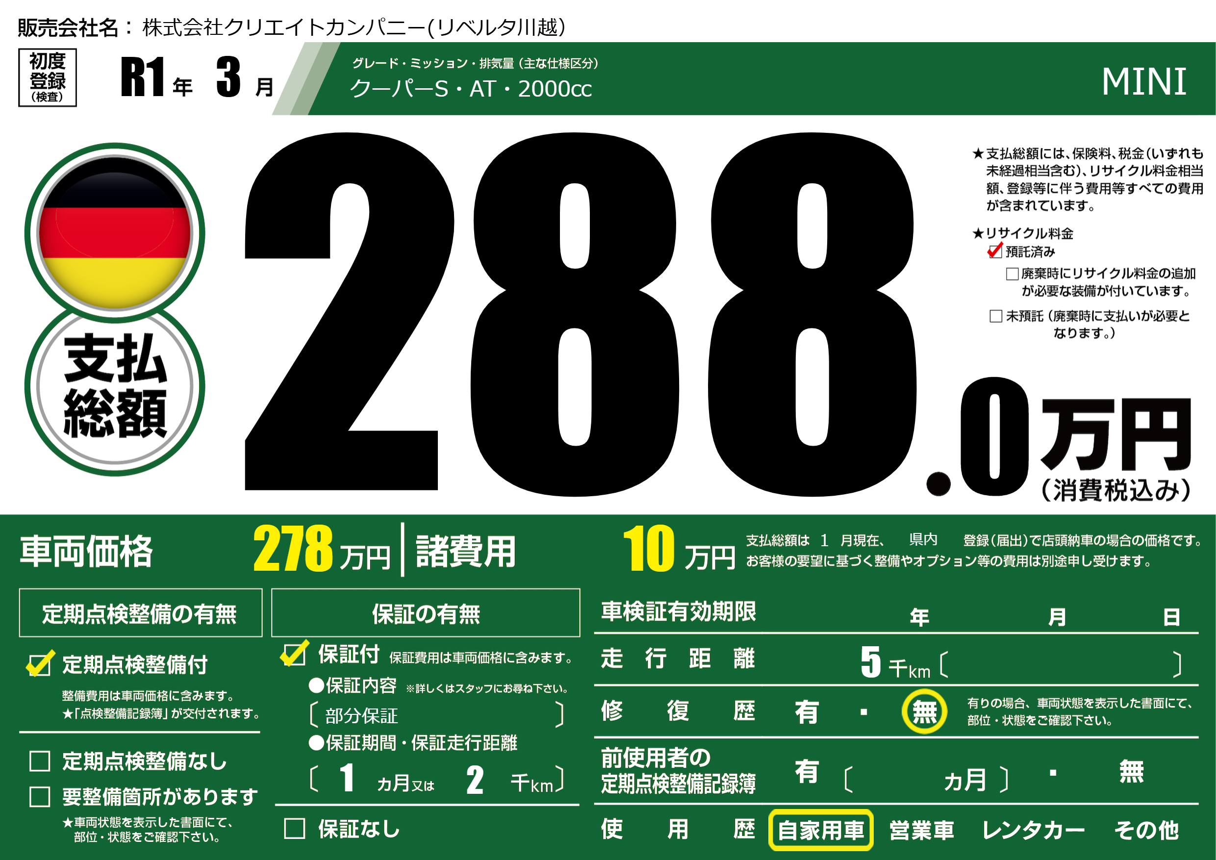 | 走行キロ | 0.5万km | 初年度登録 | R1年3月 |