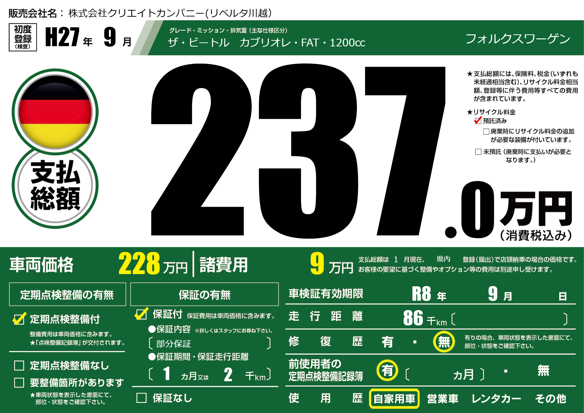 | 走行キロ | 8.6万km | 初年度登録 | H27年9月 |