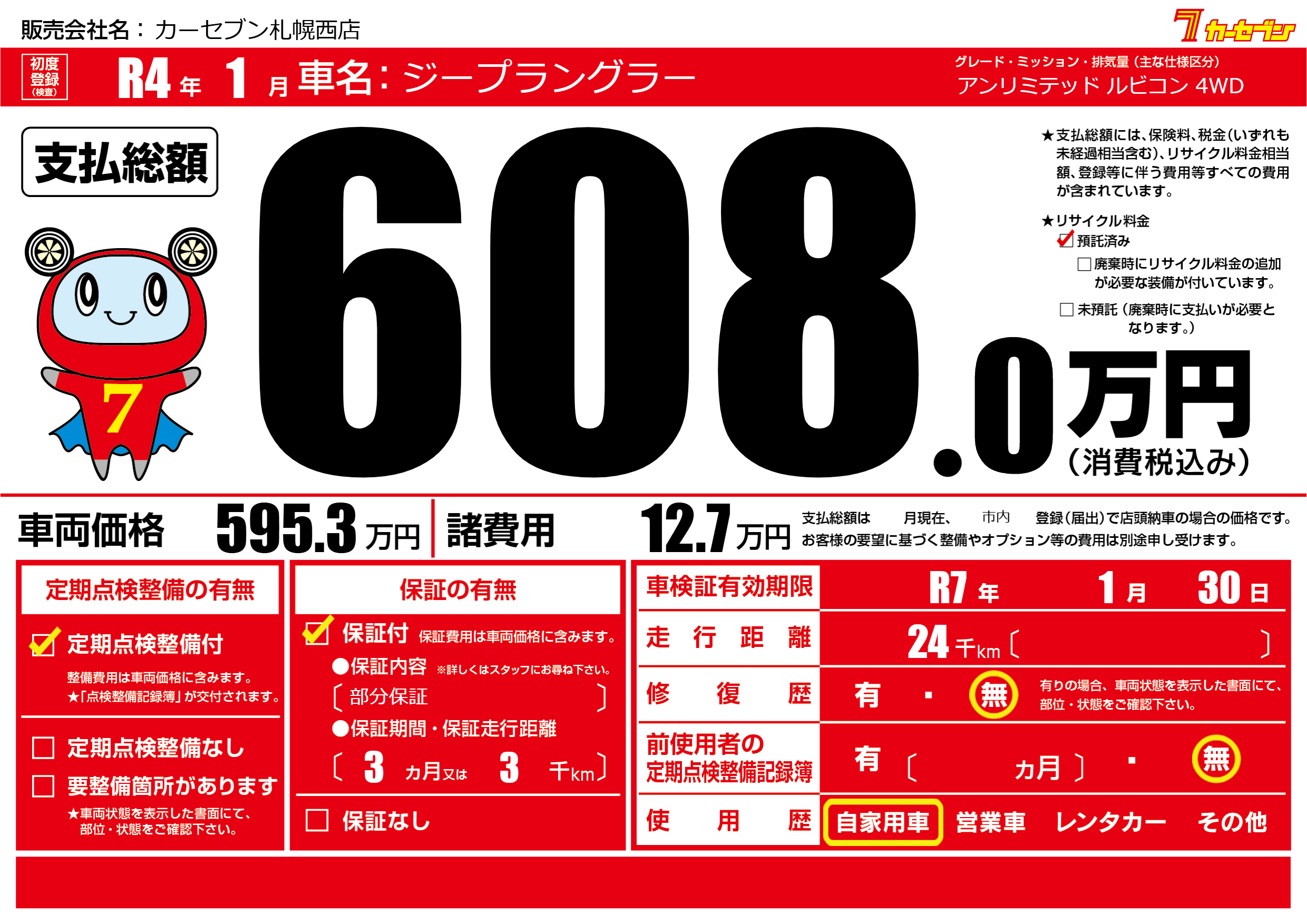 | 車名 | ジープラングラー | グレード ミッション 排気量 |