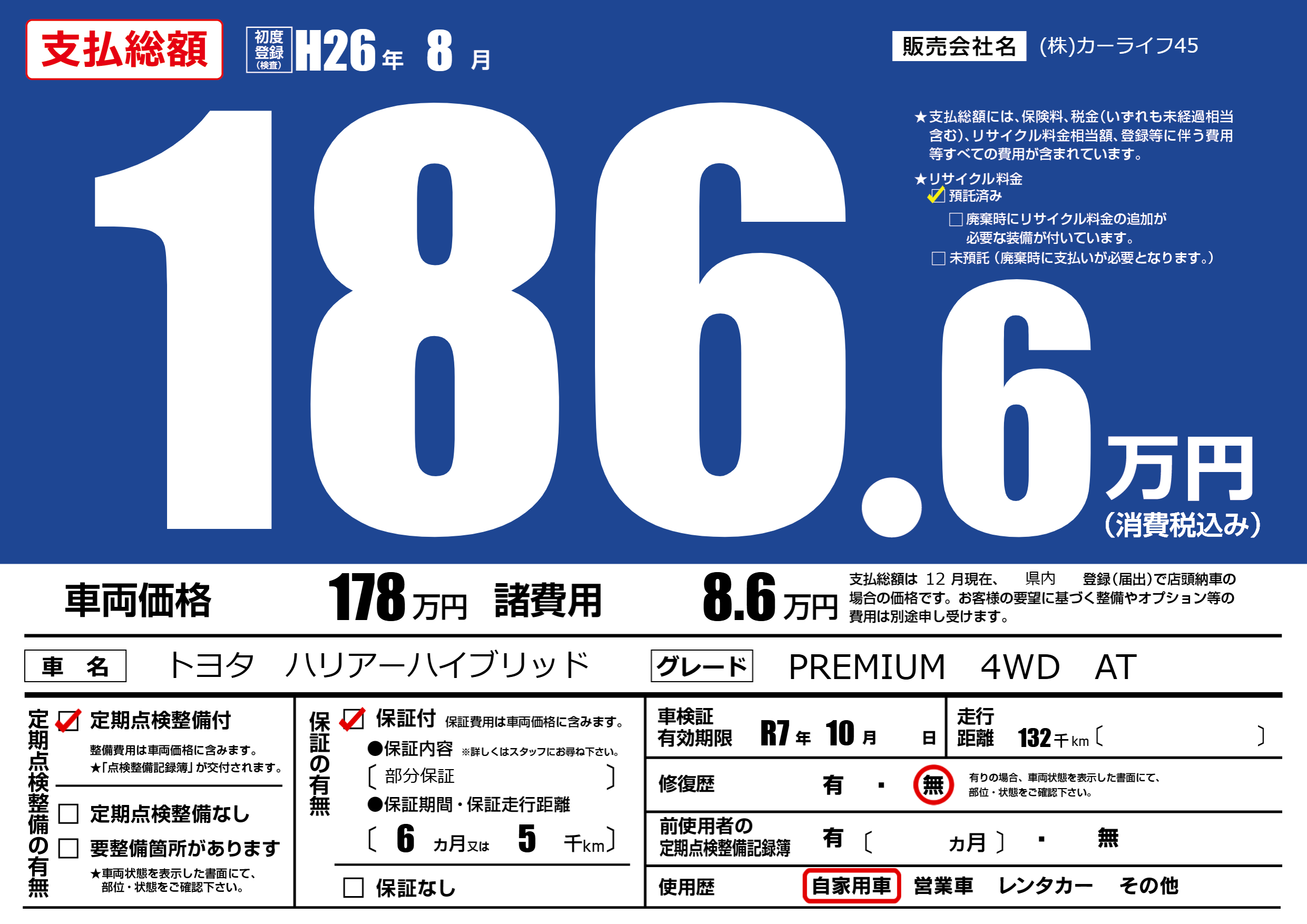 | 走行キロ | 13.2万km | 初年度登録 | H26年8月 |