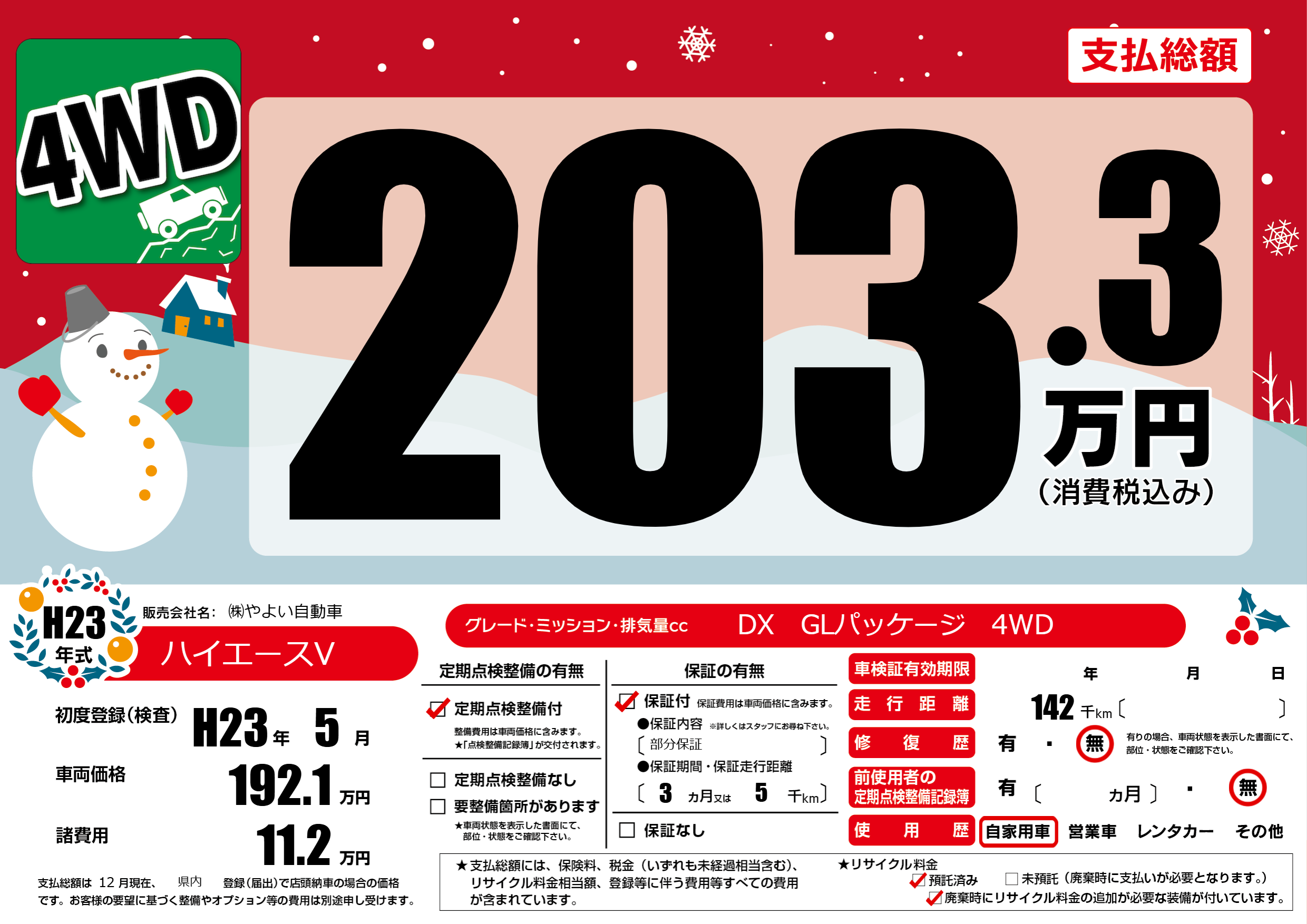 | 走行キロ | 14.2万km | 初年度登録 | H23年5月 |