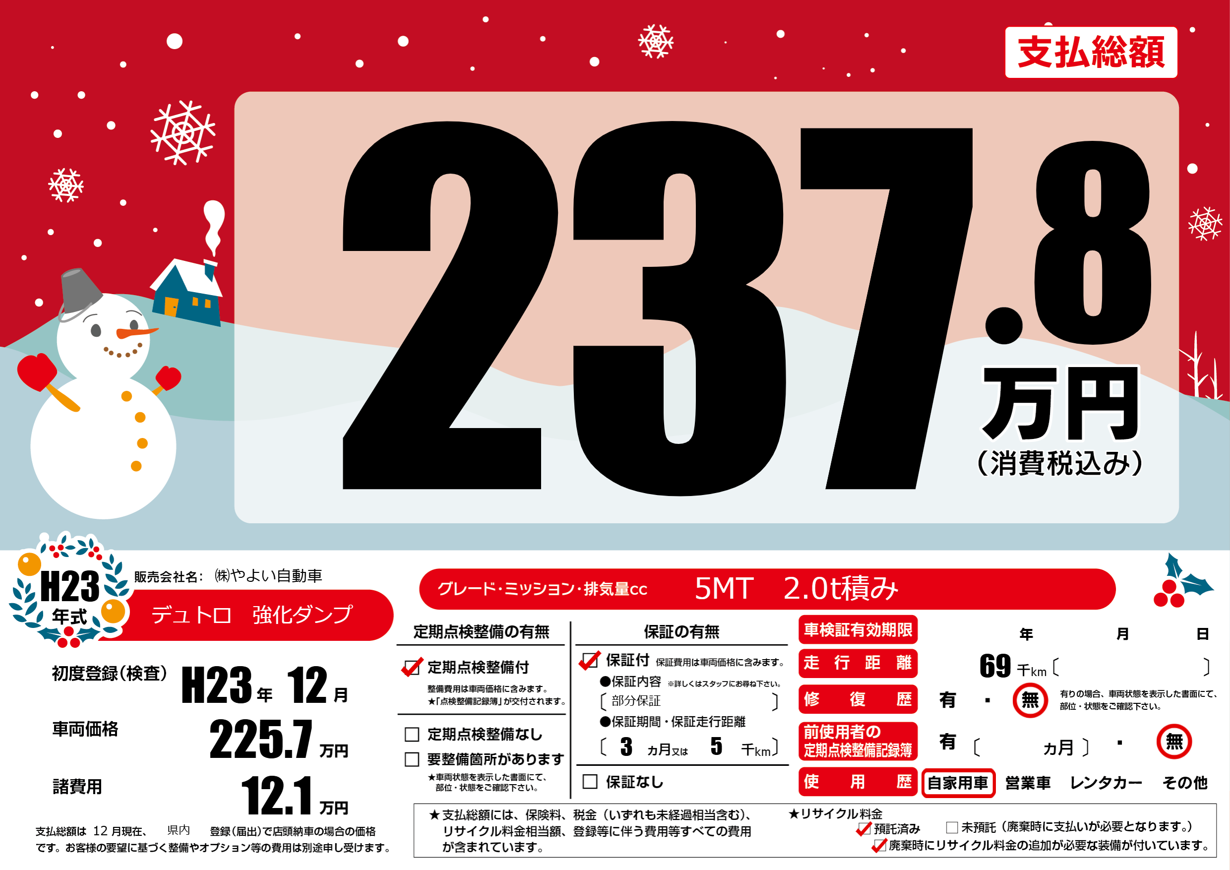 | 走行キロ | 6.9万km | 初年度登録 | H23年12月 |