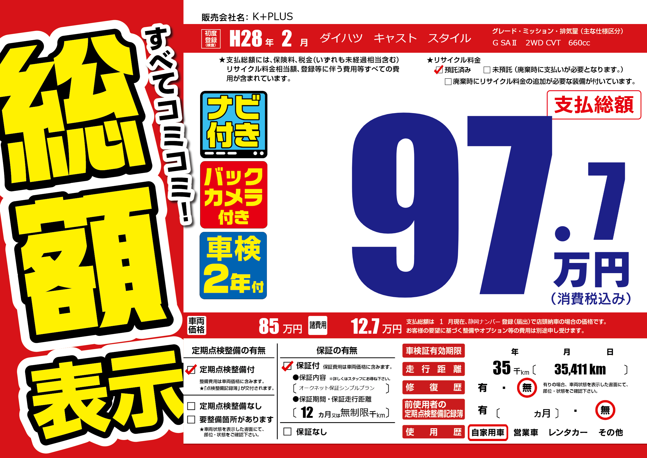 | 走行キロ | 3.5万km | 初年度登録 | H28年2月 |