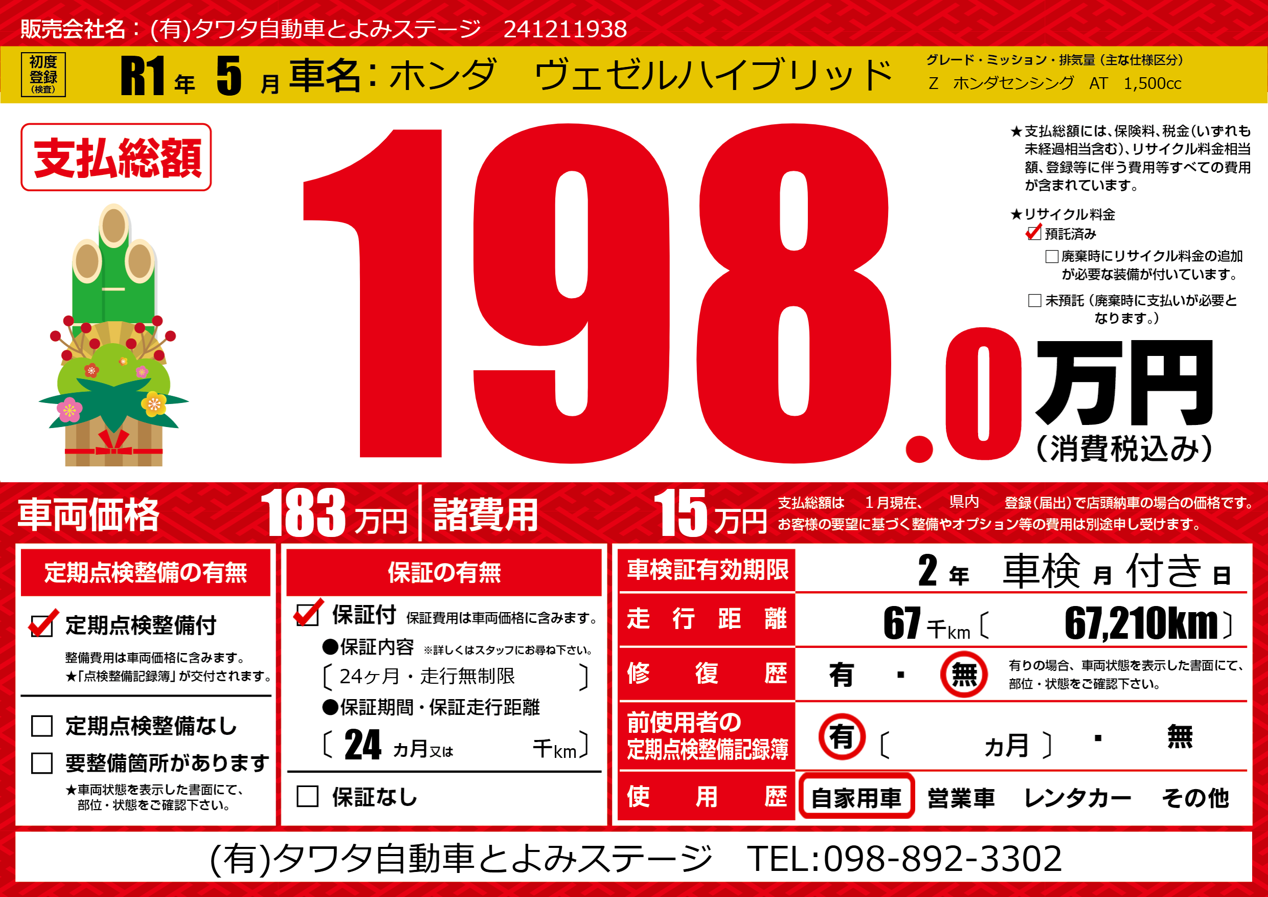| 車名 | ホンダ ヴェゼルハイブリッド | グレード ミッション 排気量 |
