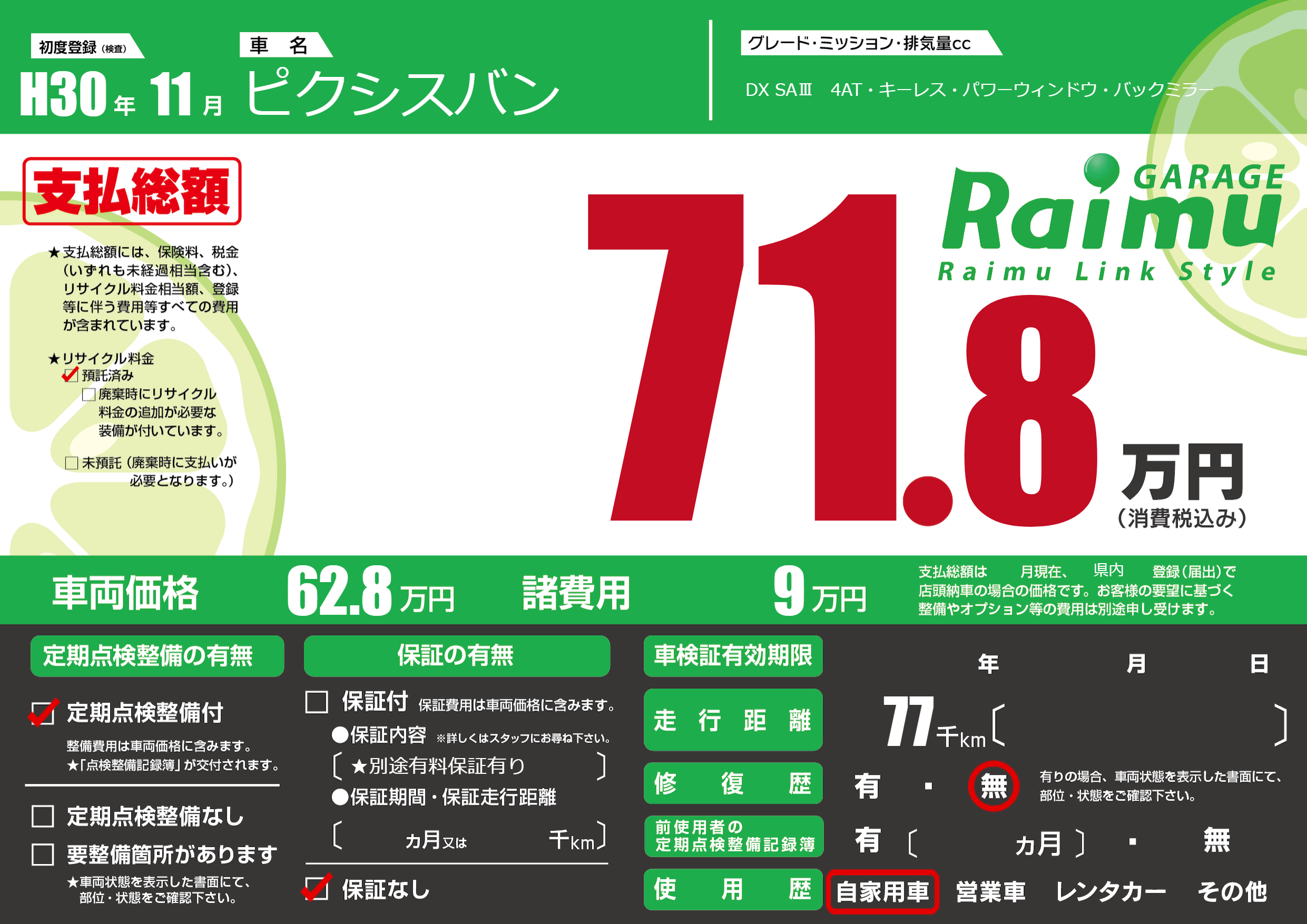 | 走行キロ | 7.7万km | 初年度登録 | H30年11月 |
