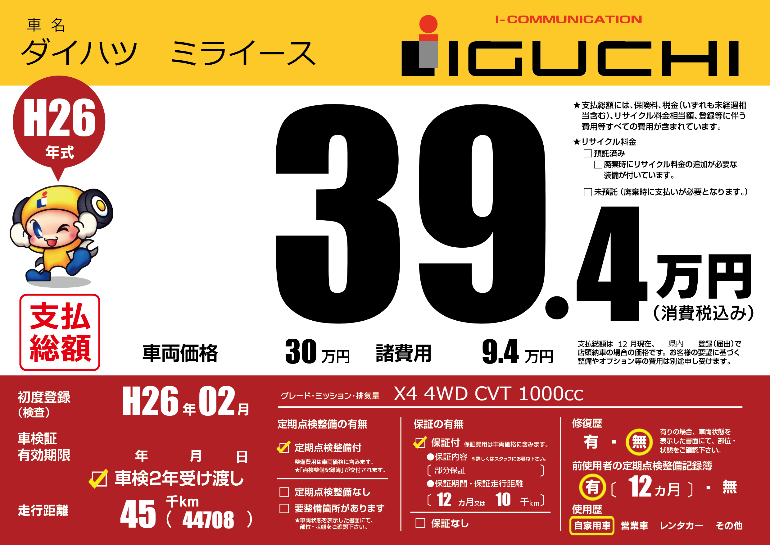 | 走行キロ | 4.5万km | 初年度登録 | H26年02月 |
