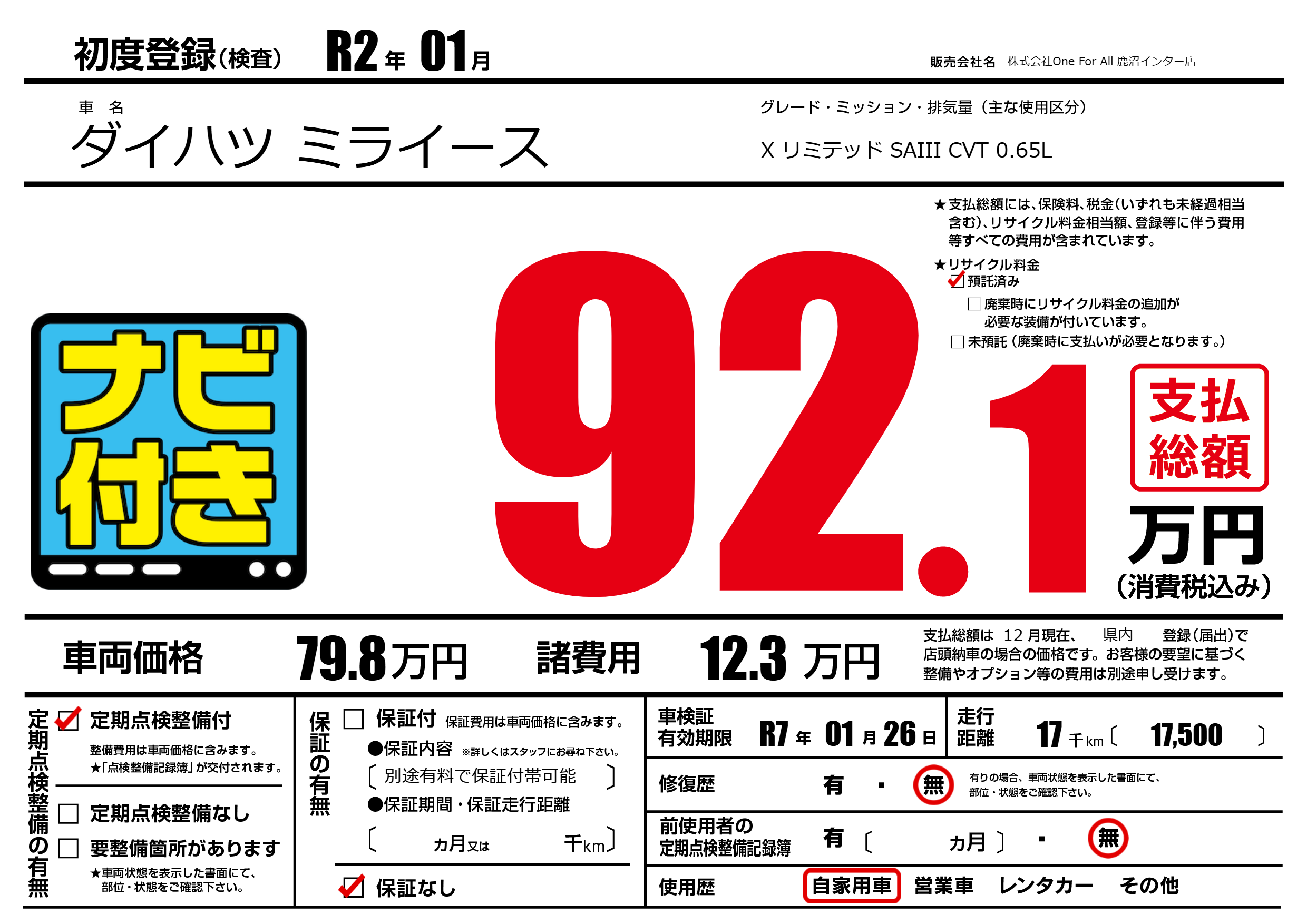 | 走行キロ | 1.7万km | 初年度登録 | R2年01月 |