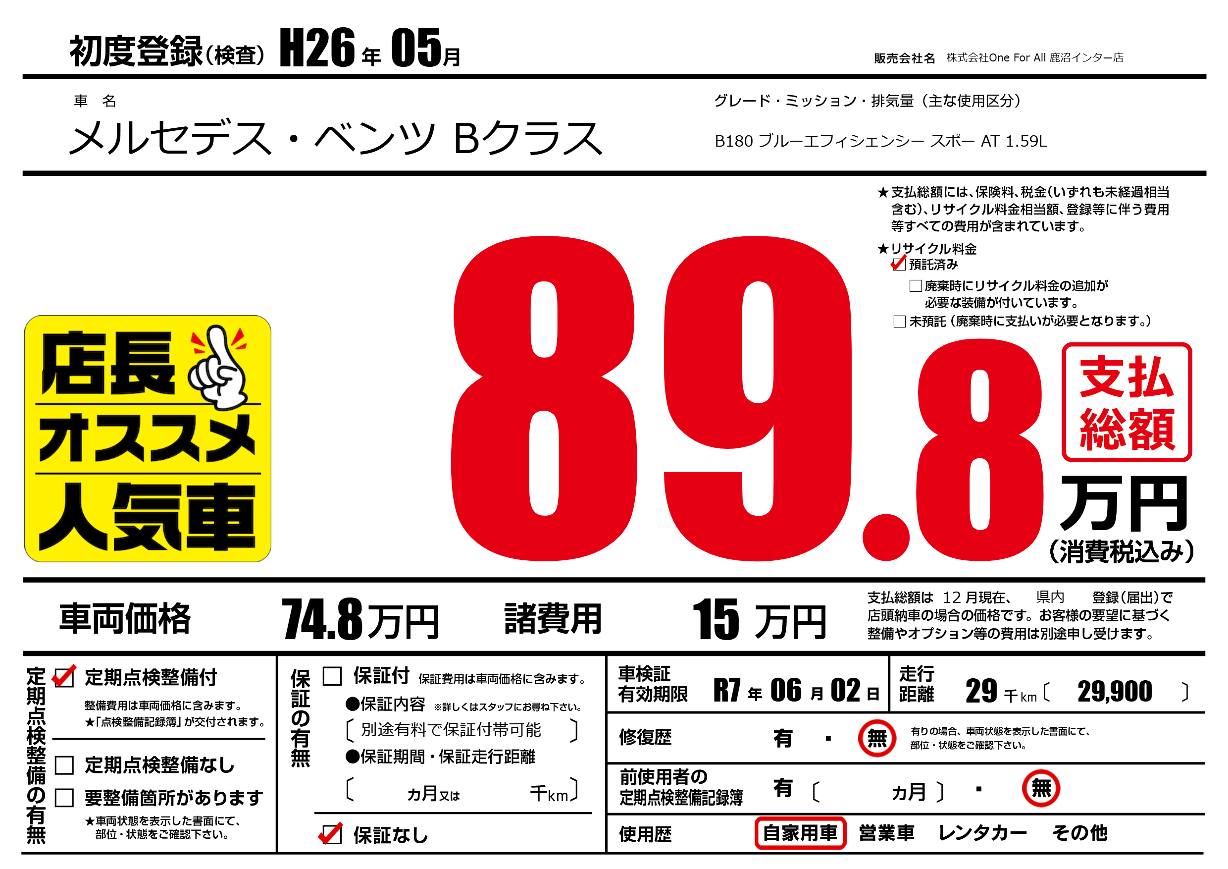 | 車名 | メルセデス・ベンツ Bクラス | グレード ミッション 排気量 |