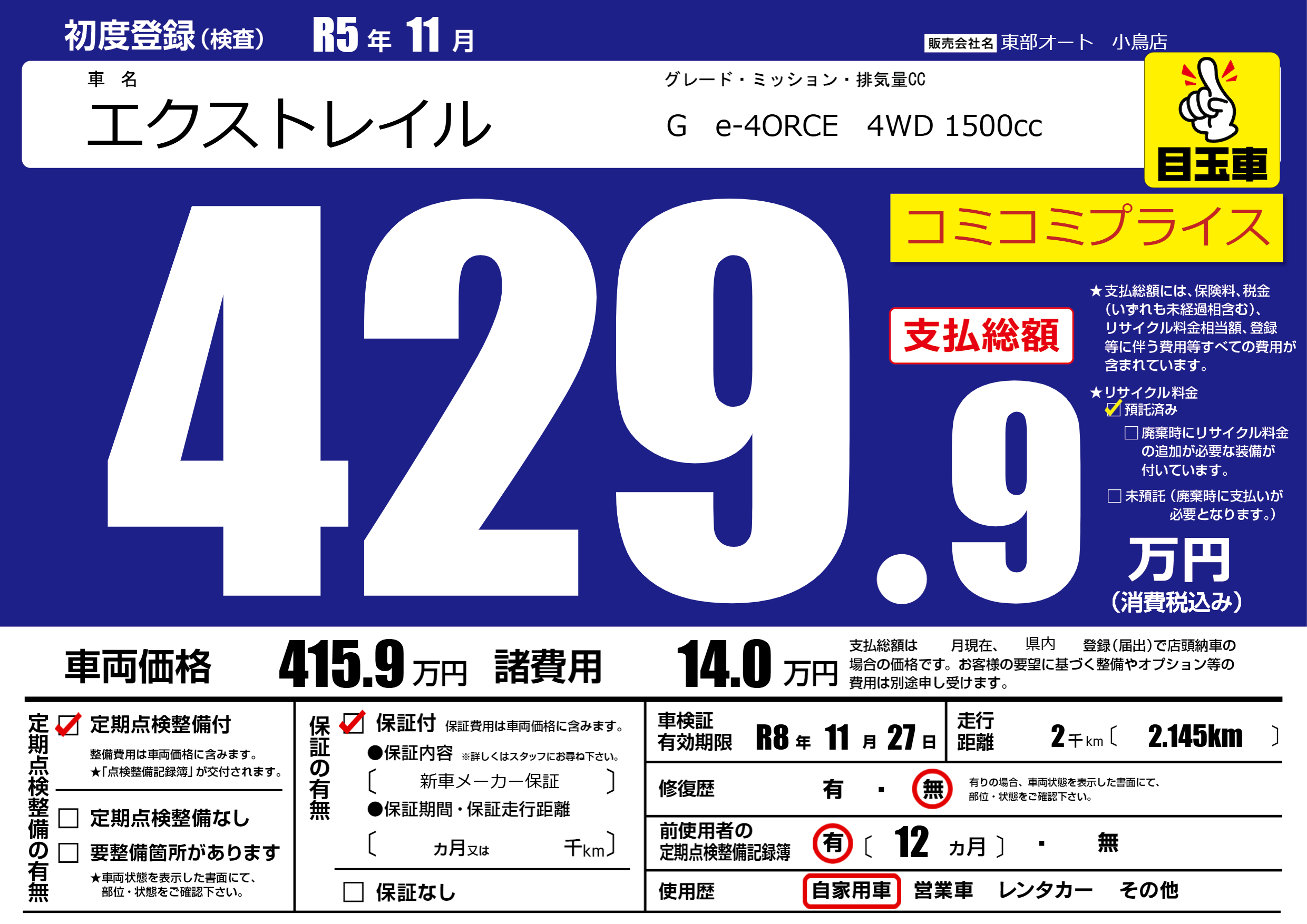 | 車検制限 | R8年 11月 27日 | ||