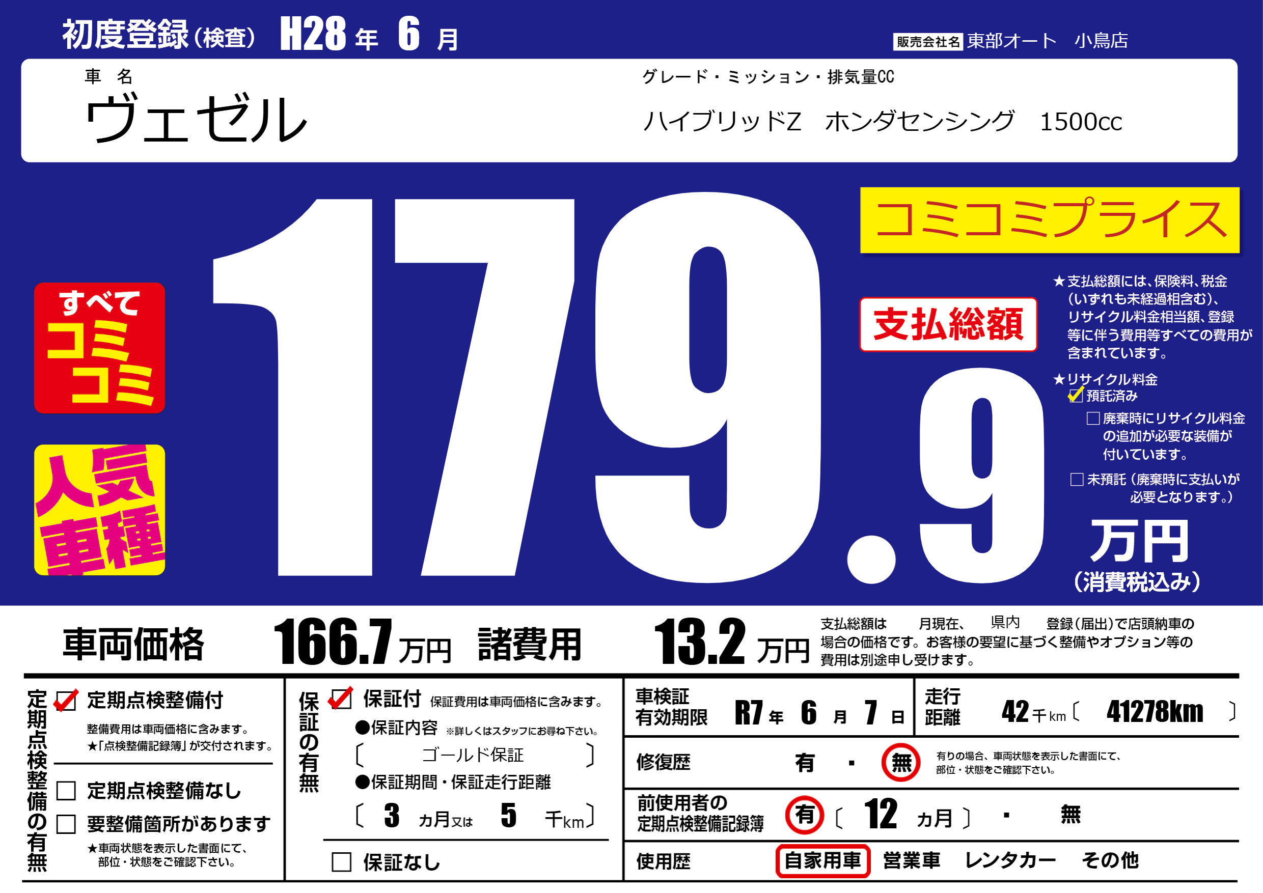 | 走行キロ | 4.2万km | 初年度登録 | H28年6月 |