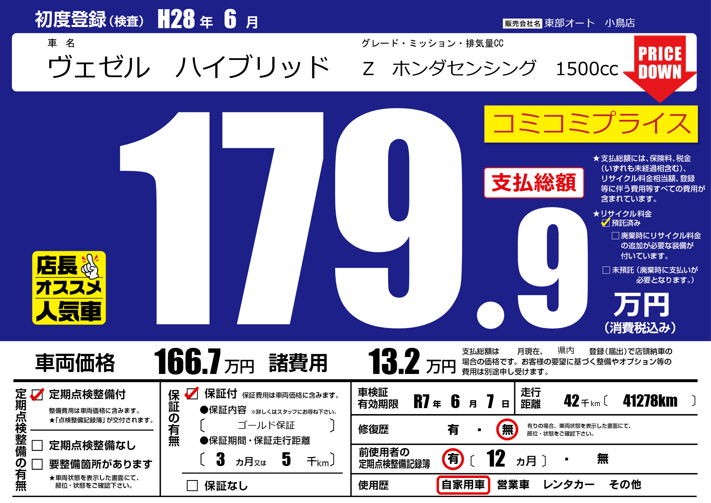| 車名 | ヴェゼル ハイブリッド | グレード ミッション 排気量 |