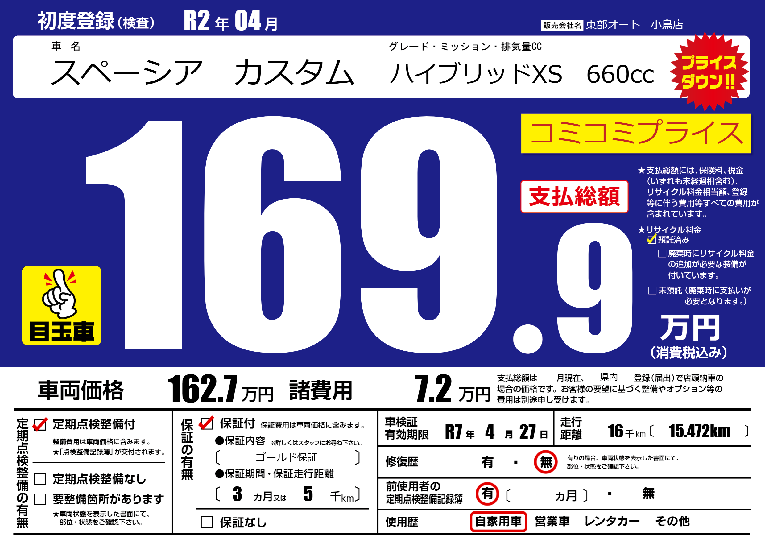 | 走行キロ | 1.6万km | 初年度登録 | R2年04月 |