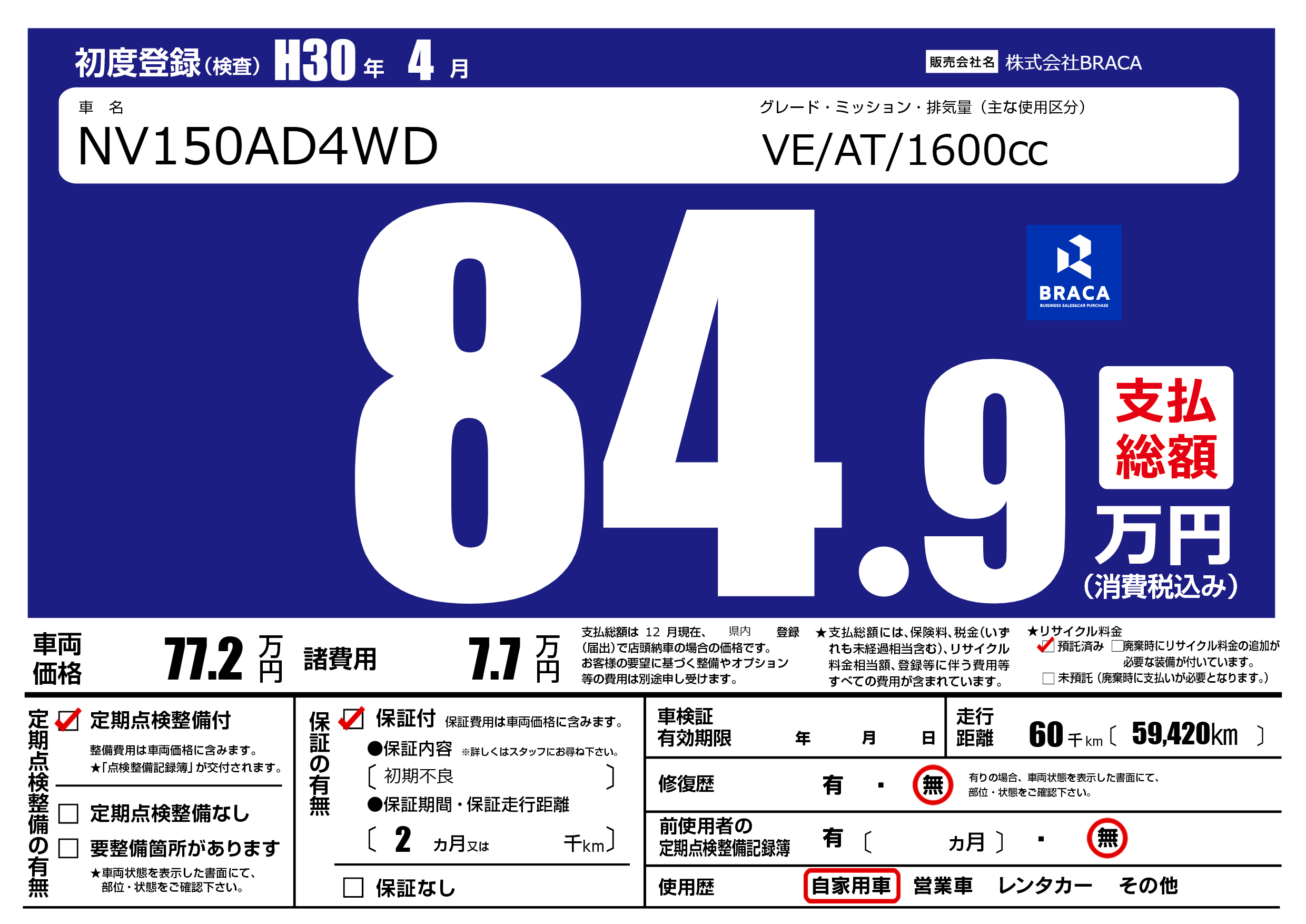 | 車名 | NV150AD4WD | グレード ミッション 排気量 |