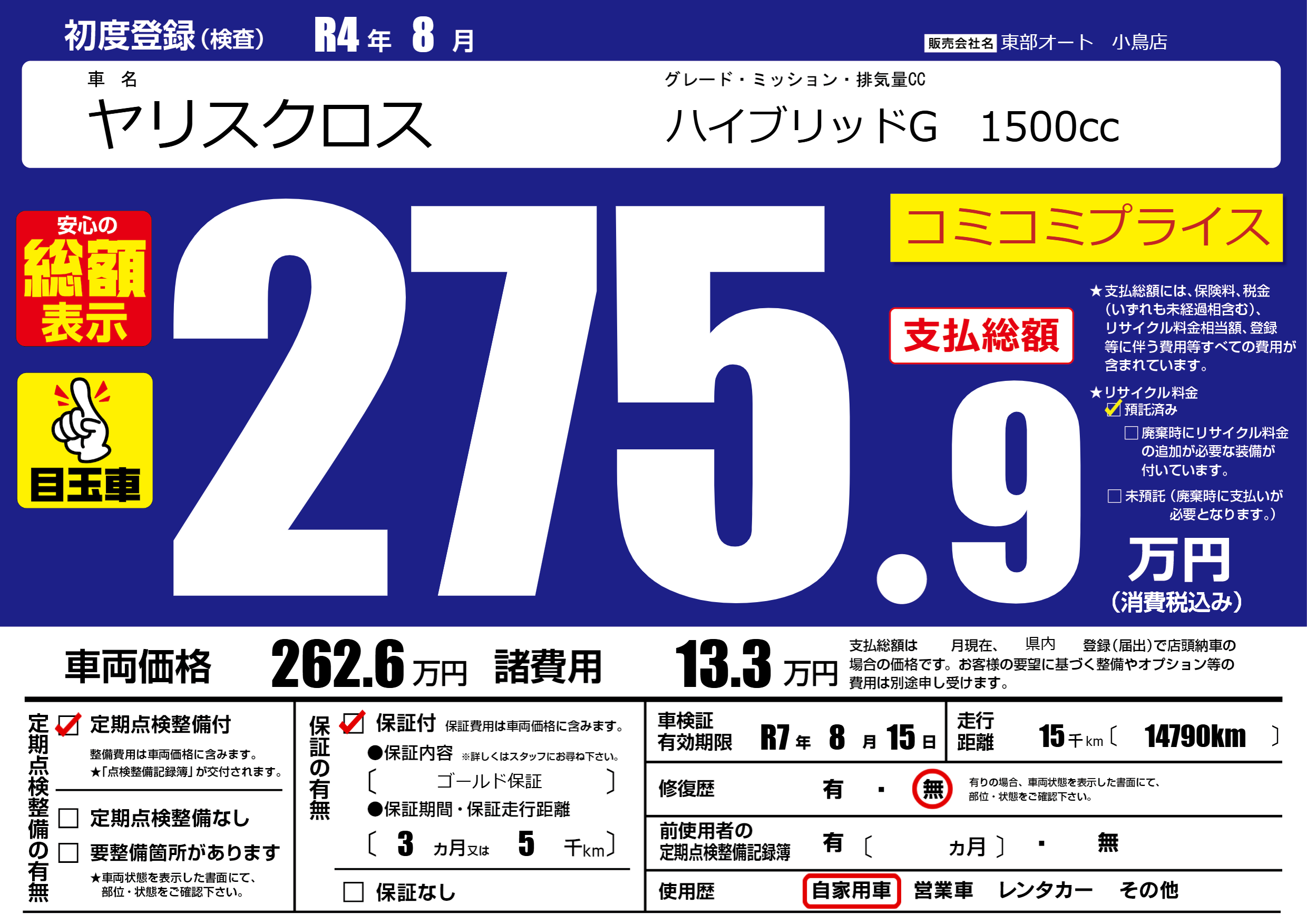 | 車検制限 | R7年 8月 15日 | ||