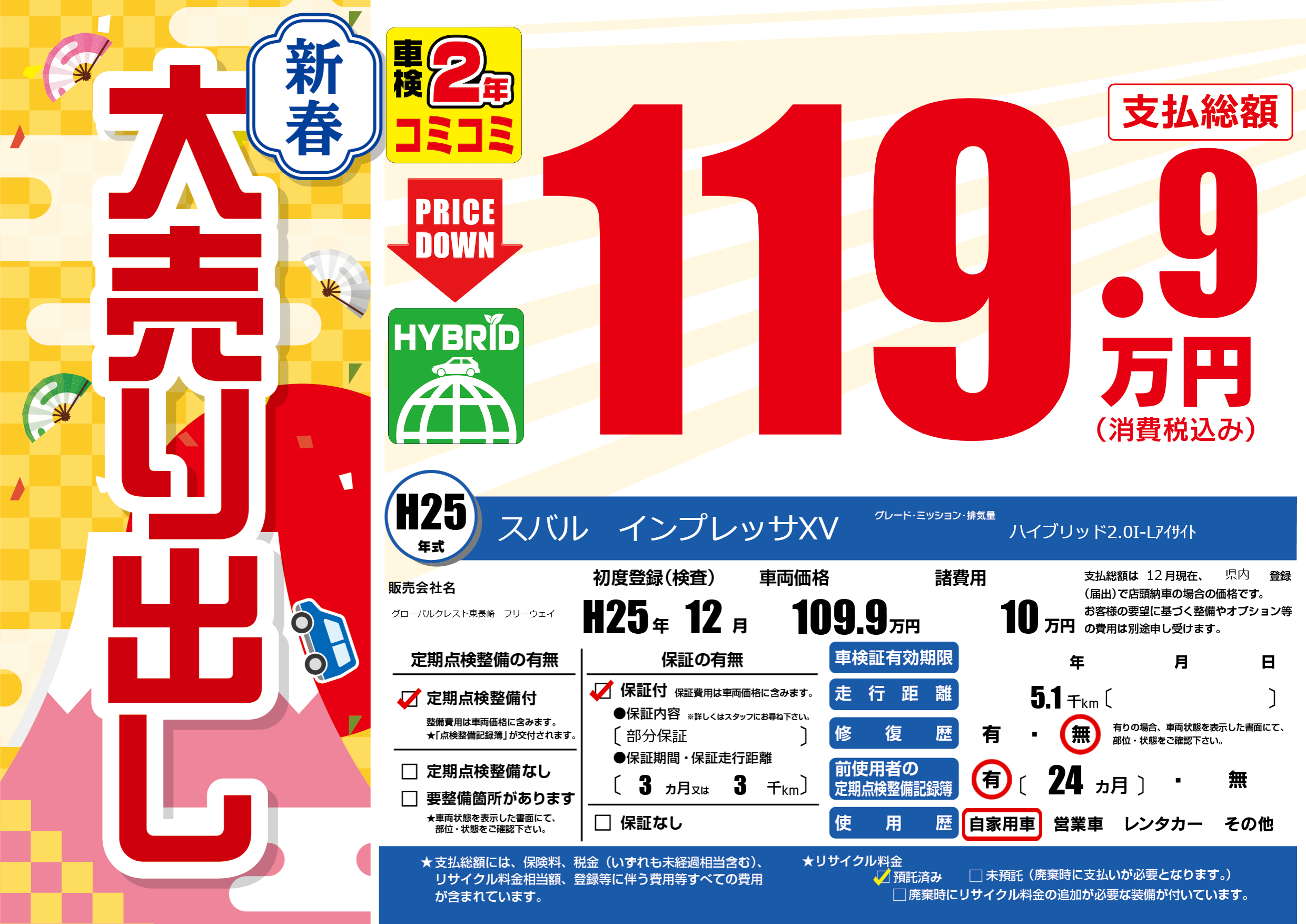 | 走行キロ | 0.5万km | 初年度登録 | H25年12月 |