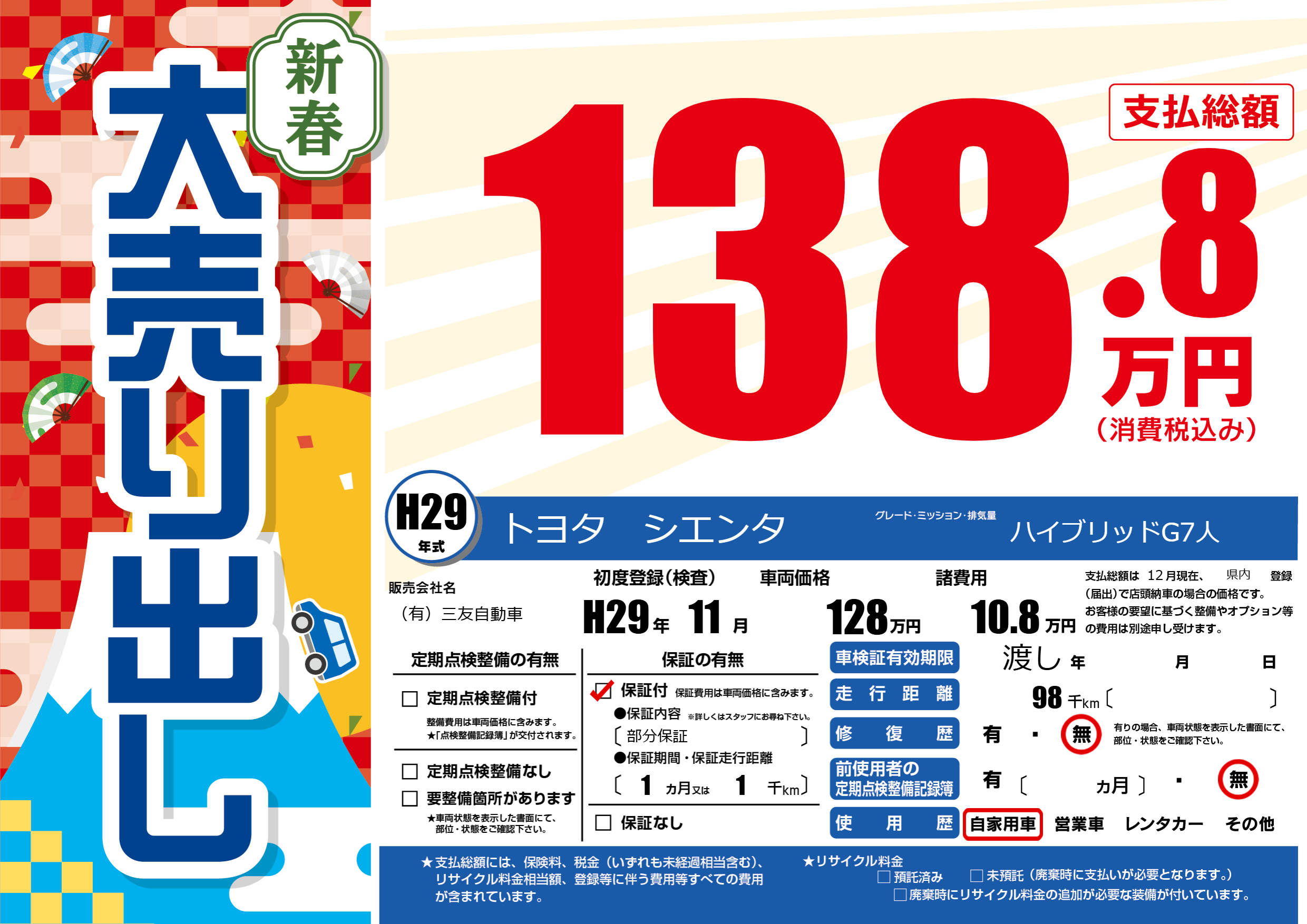 | 車名 | トヨタ シエンタ | グレード ミッション 排気量 |