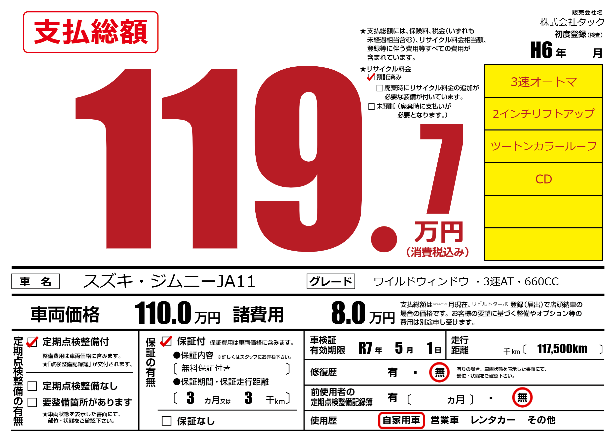 | 車名 | スズキ・ジムニーJA11 | グレード ミッション 排気量 |