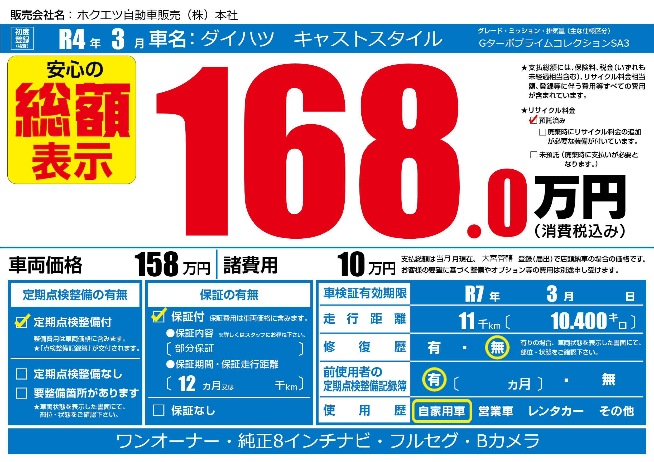 | 走行キロ | 1.1万km | 初年度登録 | R4年3月 |