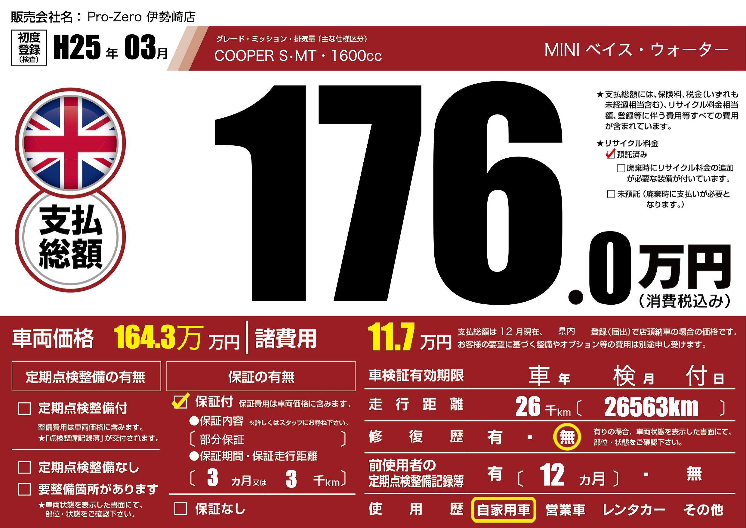 | 車名 | MINI ベイス・ウォーター | グレード ミッション 排気量 |