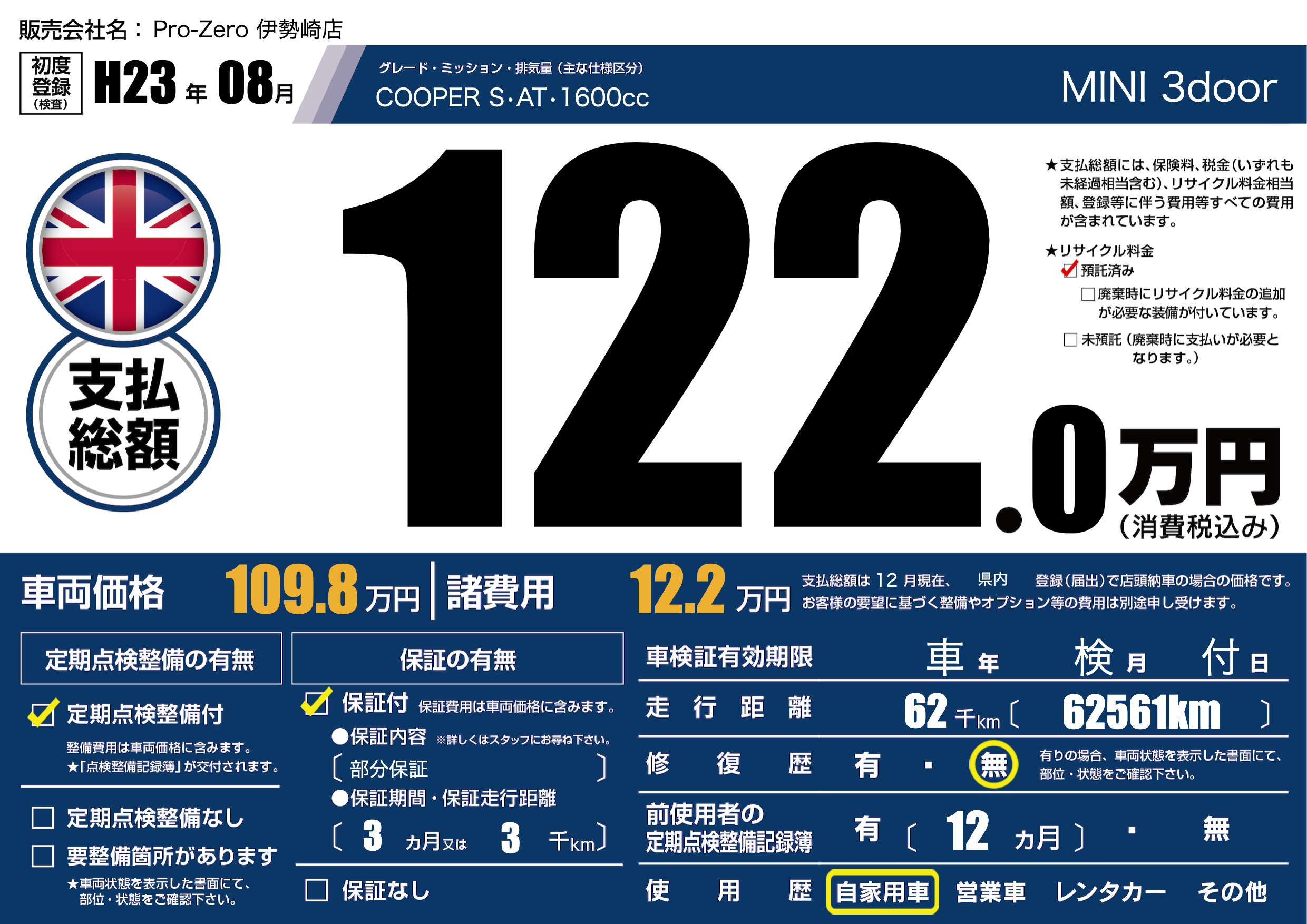| 車名 | MINI 3door | グレード ミッション 排気量 |