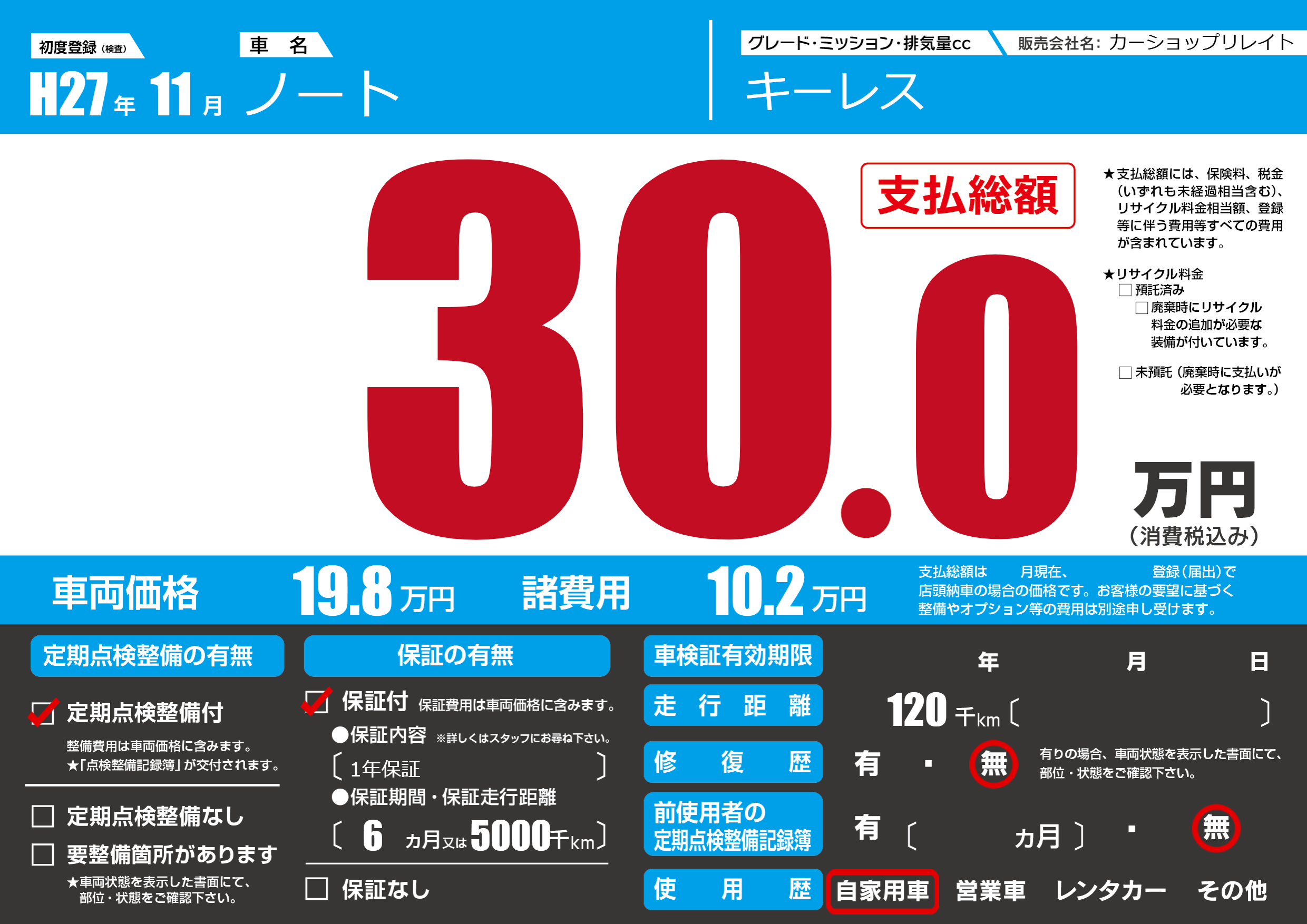 | 走行キロ | 12万km | 初年度登録 | H27年11月 |