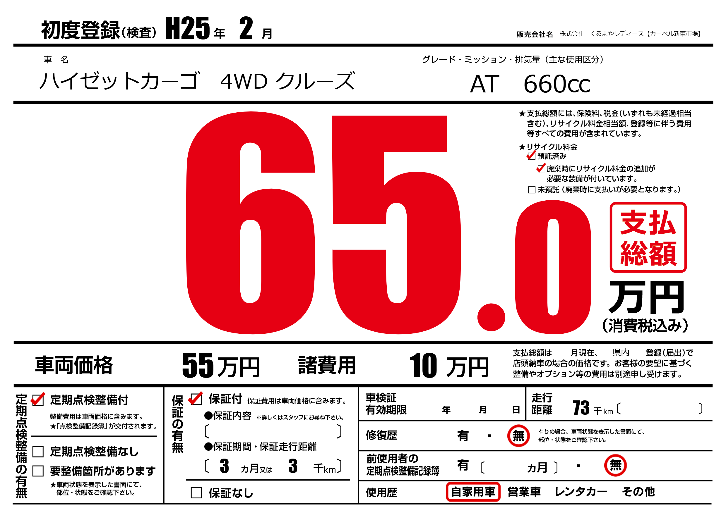 | 走行キロ | 7.3万km | 初年度登録 | H25年2月 |